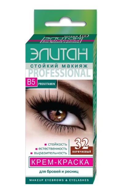 Унікальна стійка крем-фарба для брів та вій від Елітан не тільки надасть насичений натуральний відтінок, а й збагатить вітамінним комплексом, адже у складі фарби містяться вітамін В5.Вії менше випадають, брови більш блискучі та слухняні. У складі фарба, оксилювач, спеціальна щіточка для фарбування та спонжі