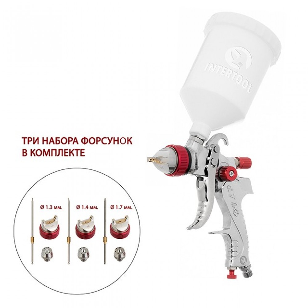 Модель краскопульта INTERTOOL PT-0153 — это профессиональный инструмент, разработан на основе технологии HVLP, что позволяет значительно снизить потери материалов на туманообразование. С помощью данной технологии достигаются высокие показатели (до 75%) переноса ЛКМ на необходимую поверхность. Объем пластикового бачка с верхним расположением составляет 600 мл. Показатель расхода воздуха при рабочем давлении до 3 атм не превышает 300 л/мин. Распыление может осуществляться овальным или плоским факелом. В комплекте три форсунки: 1,3; 1,4; 1,7 мм для работы с различными по вязкости ЛКМ.