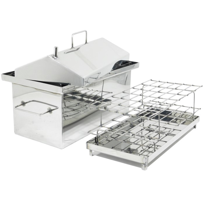 Коптильня из нержавеющей стали, высоко стойкая к проявлению ржавчины, что и сохраняет качество продуктов. Данная коптильня состоит из нержавеющего поддона для сборки жира, двух ярусных сеток, которые имеют ребра жесткости и выдерживают продукты любого размера. Коптильня имеет гидрозатвор.