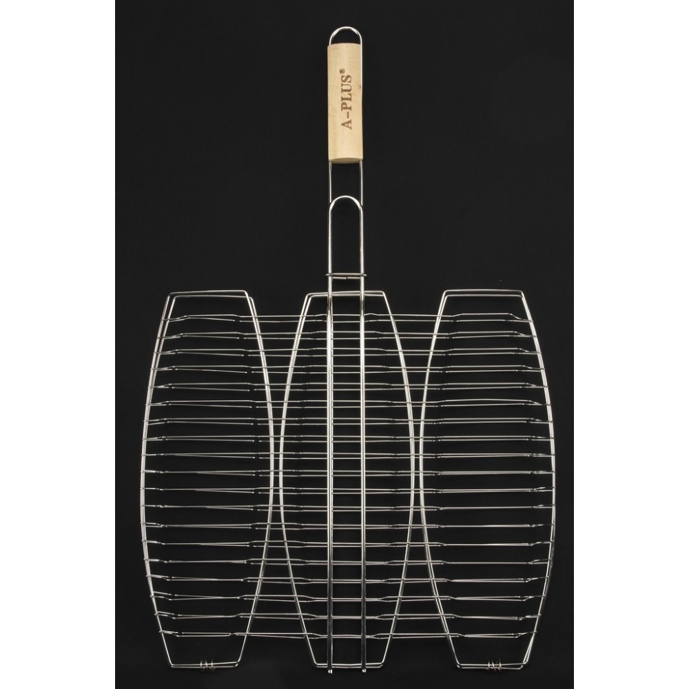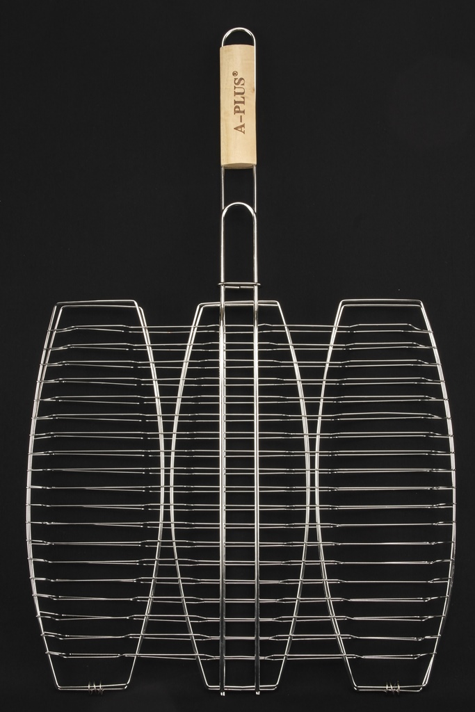 Решетка-гриль для рыбы лучший выбор для пикника на природе и на даче.С приходом теплой погоды многие отправляются на природу для отдыха, а какой отдых без вкусно приготовленных продуктов на открытом огне. В этом Вам поможет такое замечательное приспособление, как решетка для гриля. Она легкая по весу и удобная в эксплуатации. Изготовлена из хромированной стали, не поддается коррозии, не выделяет вредных веществ и не меняет вкус и запах еды даже при высокой температуре. Ручка деревянная. Форма и удачная конструкция дает возможность с легкостью закрепить решетку на мангале, а кольцо на ручке фиксирует решетку. Готовить на решетке очень удобно и быстро, а интересная форма переплетения прутьев придаст уж очень аппетитный вид готовой рыбе.