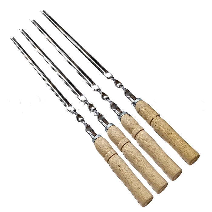 Шампур - полоса металла шириной от 10 до 20 мм, один конец которой заострен. Заострение на конце обеспечивает легкость прокалывания мяса при его насаживании на шампур. На другом конце шампура ручка, в данном шампуре она изготовлена из дерева. Деревянная ручка на шампуре очень удобна для хвата рукой и не нагревается в процессе приготовления. Шампур имеет прямое плоское сечение, что не позволяет продуктам проворачиваться на шампуре во время приготовления, тем самым обеспечивая равномерную степень поджаривания со всех сторон.