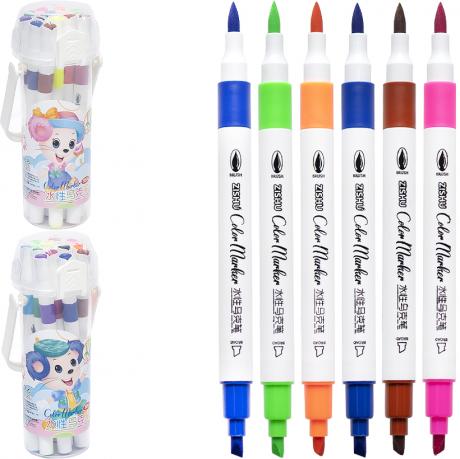 Набір двосторонніх маркерів для малювання підходять для професійного малюнка і для хобі, при створенні листівок або в скрапбукінгу. Два види пишучого вузла: широкий, зрізаний під кутом кінчик і еластичний пензлик. Чорнило на водній основі. Розмір упаковки 18*6см