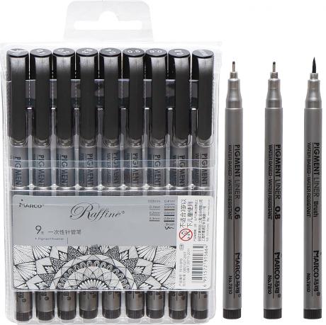 Набір лінерів для професійного використання, підходить для креслення, ескізів та обведення. Чорнило водо- та світлостійке, підходить для ксерокопіювання. Металевий вузол спеціальної форми забезпечує точність при кресленні. Лінери одноразові, з водною основою. Товщина лінії: 0,05; 0,1; 0,2; 0,3; 0,4; 0,5; 0,6; 0,8 мм, плюс лінер-пензлик. У наборі 9 штук.