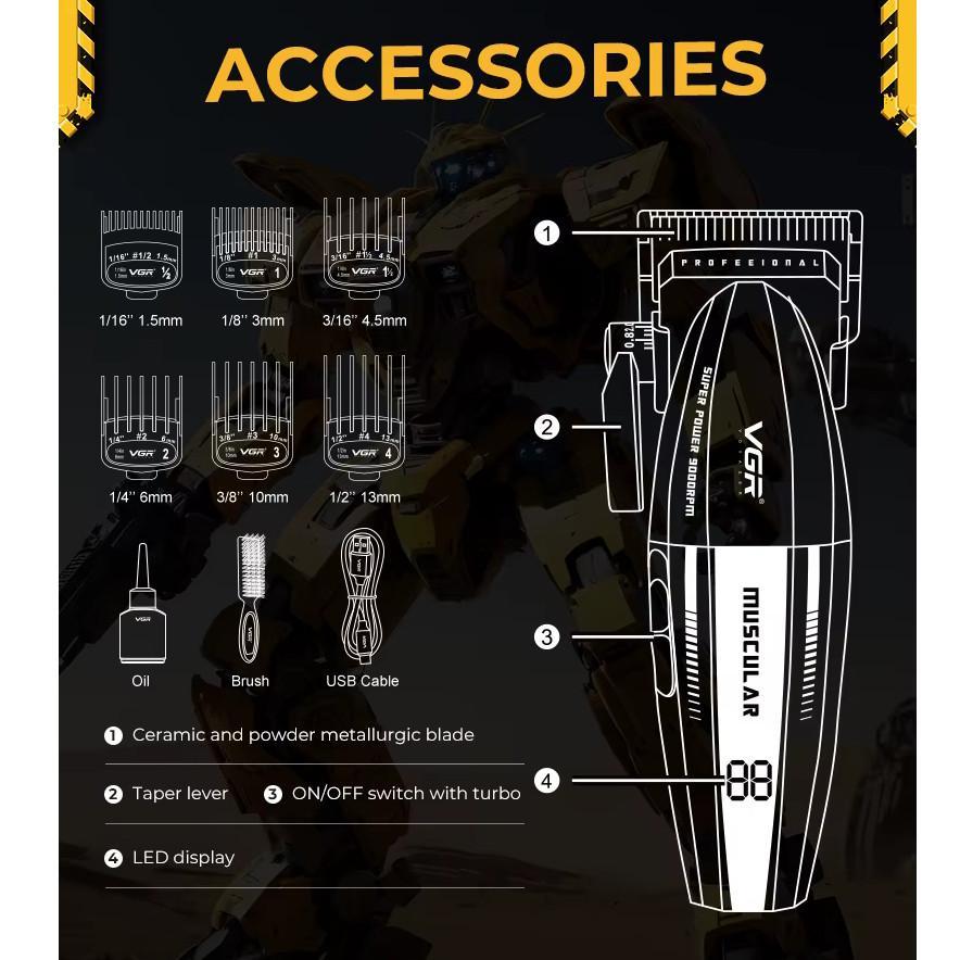 Аккумуляторная машинка для стрижки (clipper) VGR V-285, 6 насадок, 9000 RPM, 2000 mAh, LED display