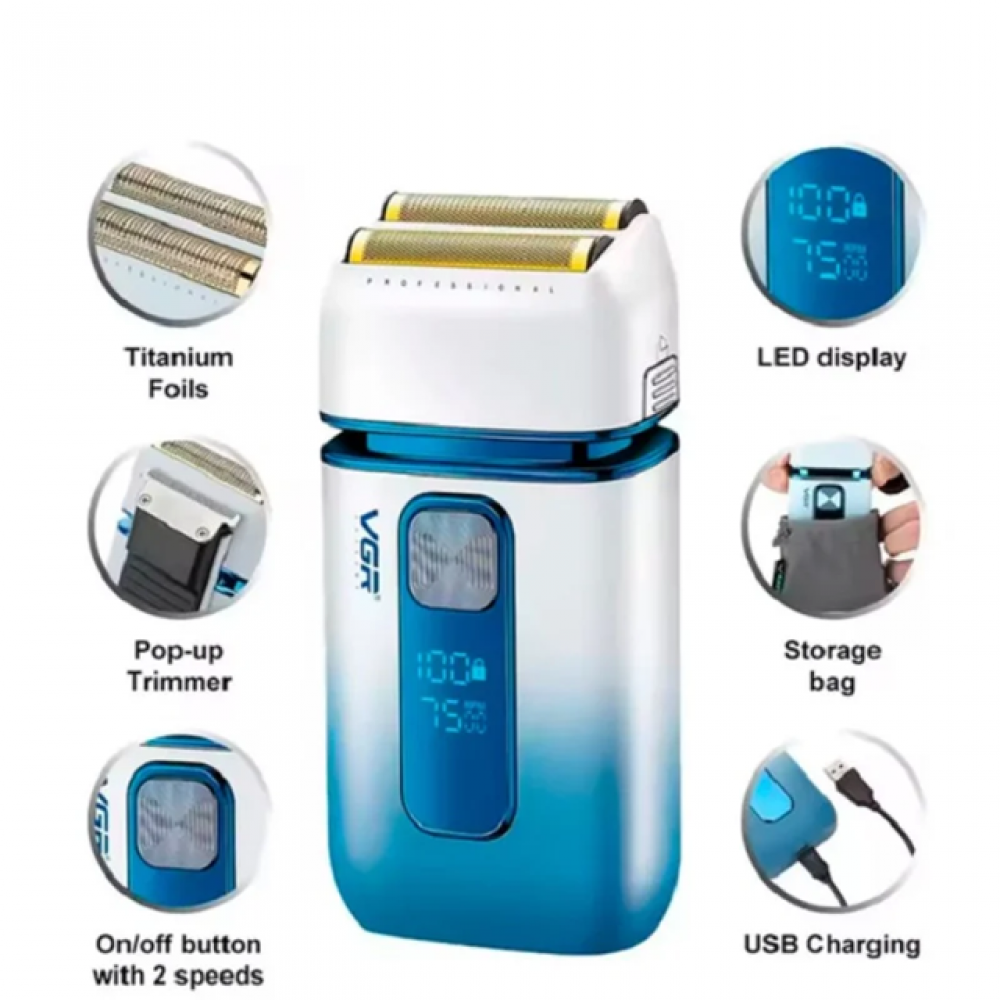 Электробритва VGR V-362 – это инструмент, который подходит как для бритья, так и для стрижки волос «под ноль». Незаменимая вещь для любого парикмахера, мастера или барбера. А также отличный инструмент для бритья в домашних условиях. Особенностью шейвера является наличие двух бреющих сеток, что обеспечивает чистый срез волос, словно бритвой-станком. бреющие сетки подвижны, что позволит не только регулировать момент нажатия, но и обеспечит четкое повторение контуров лица или головы для максимально качественного результата. Кроме того, на задней части корпуса имеется триммер, делающий электробритву универсальным устройством, позволяющим осуществлять бритье и окантовку. Бритье бриющего шейвера состоит из двух сеток и двух ножей. Сетки изготовлены из титановой фольги и являются гипоаллергенными. Сетка-картридж легко меняется при необходимости. Ножи независимы и двигаются асинхронно, что значительно улучшает эффективность бритья. При необходимости ножи тоже могут быть заменены. Шейвер работает от аккумулятора емкостью 1200 мАч, который обеспечивает более 60 минут автономной работы. Для зарядки шейвера можно использовать любое зарядное устройство от телефона, в комплекте поставляется USB-кабель. Корпус бритвы выполнен из высококачественного пластика. На корпусе есть кнопка включения-выключения, разъем для зарядки, LED-индикатор зарядки в процентах, оповещение о своевременной очистке ножей от щетины и кнопка для отсоединения бреющей головки. Для того чтобы снять головку нужно приложить некоторые усилия. Это сделано специально для того, чтобы во время работы вы случайно не отсоединили головку и не повредили сетки с ножами. Водозащита по стандарту IPX6, позволяющая использовать шейвер, не опасаясь попадания воды.