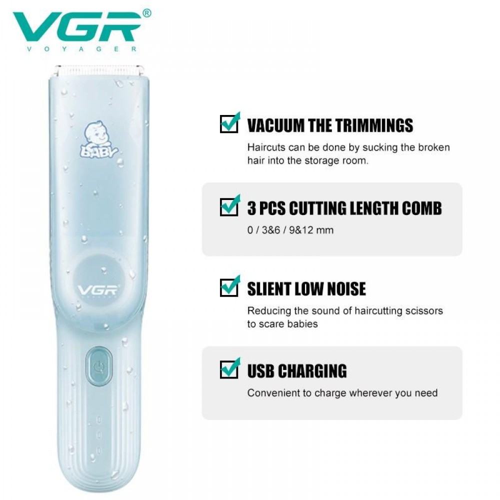 Детская машинка для стрижки с функцией сбора волос VGR V-155 BLUE, 4 безопасные насадки, бесшумная, IPX8