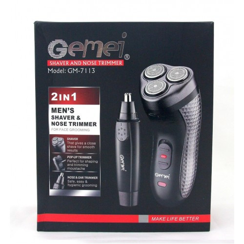 Электробритва + триммер Gemei GM 7113, 2 в 1 создана специально для мужчин, которые хотят всегда хорошо выглядеть как дома, так и в дороге. Имеется встроенный триммер плюс триммер для носа ушей. При этом о раздражении можно забыть. 3 плавающих бреющих головки которые максимально плотно соприкасаются с кожей лица,осуществляется комфортное и лёгкое бритьё. Роторная электрическая бритва с плавающими лезвиями. Оснащена выдвижным триммером для подравнивания бакенбард и усов. Работа от встроенного аккумулятора. Три бритвенные головки из высококачественной нержавеющей стали не подверженные коррозии. Световой индикатор уровня питания. Низкий уровень вибрации и шума. Триммер для носа и ушей Gemei ― предназначенный для удаления нежелательных волос на лице, в носу или ушах.