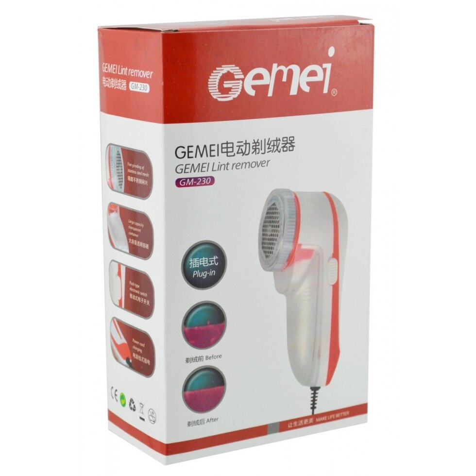 Машинка для снятия катышек Gemei GM-230 удаляет катышки и зацепки с одежды и возвращает ей первоначальную красоту. Имеет пластиковый корпус, удобную ручку и небольшую головку, оснащенную металлической сеточкой. В отличие от аналогов, работает от электросети. При соприкосновении прибора с тканью сбившиеся в катышки волокна попадают в отверстия сеточки и аккуратно срезаются острыми лезвиями. При этом машинка не порет ткань. Срезанные волокна попадают внутрь устройства в специальный прозрачный контейнер, расположенный на корпусе, благодаря чему можно видеть его наполнение. Производить его очистку нужно при заполнении на 80%, при этом достаточно его просто снять и высыпать содержимое в мусорное ведро. Прибор можно использовать как дома, так и в профессиональных заведениях по ремонту одежды. Отличается своей доступной ценой и простотой эксплуатации. Важно следить, чтобы при чистке одежды не цеплять молнии, пуговицы, заклепки, шовные соединения, нашивки и наклейки. Хранить прибор в сухом и недоступном для детей месте.