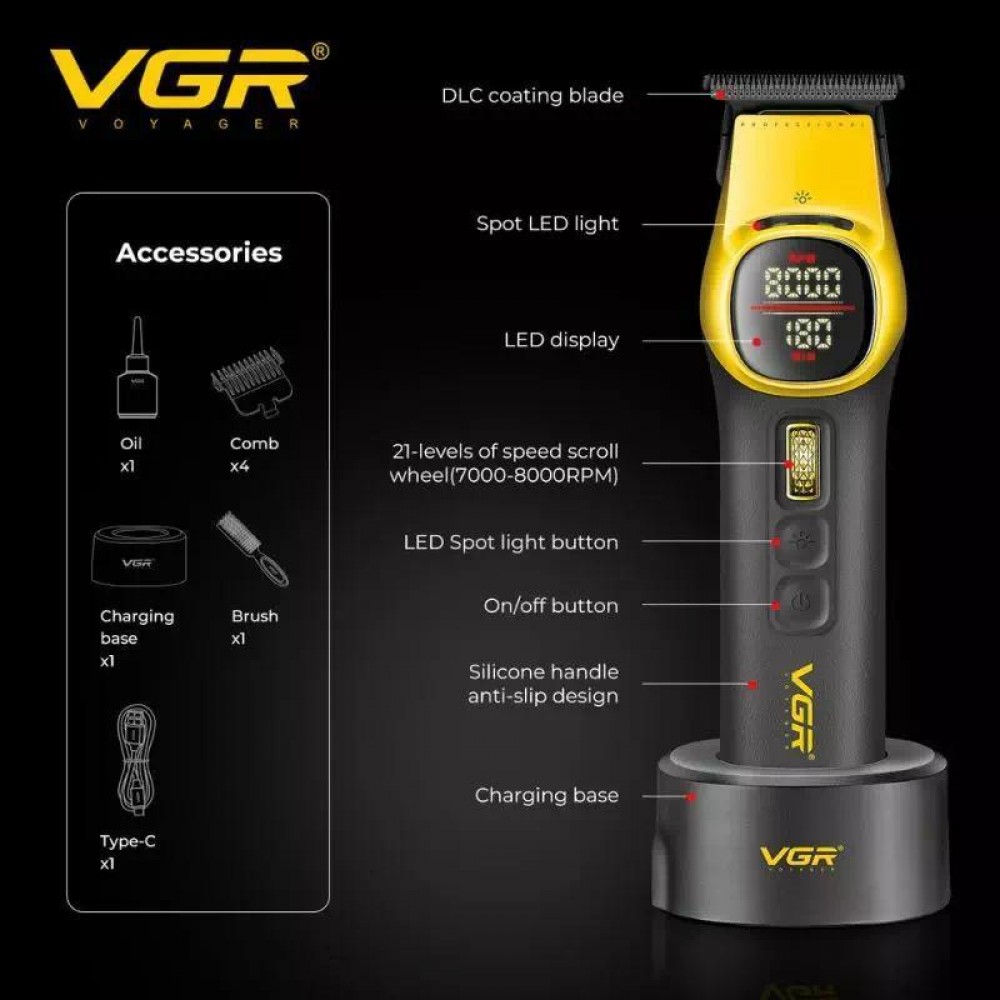 Аккумуляторная машинка для стрижки (clipper) VGR V-015, 6 насадок с магнитами, VECTOR MOTOR 9000 RPM, LED