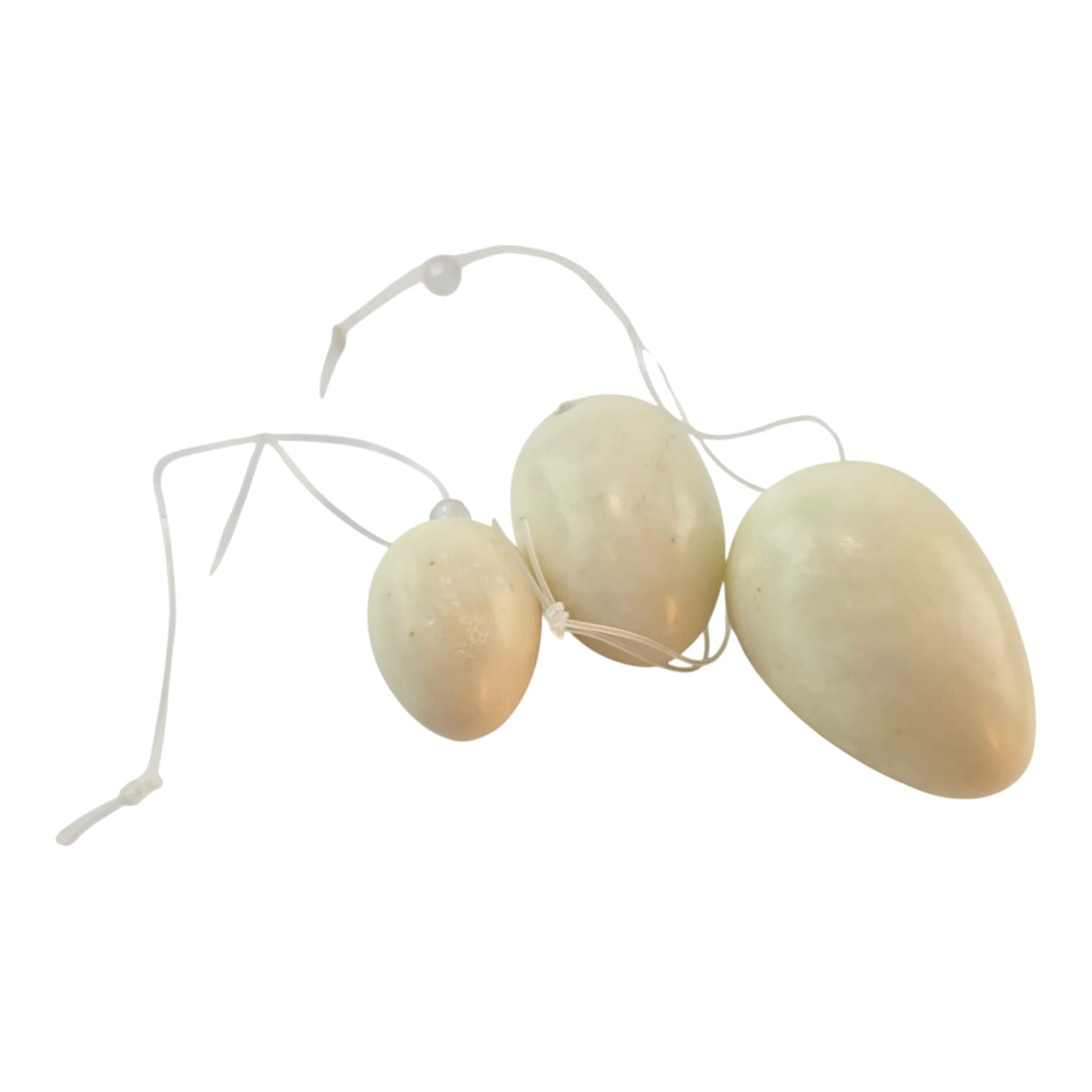 Комплект из трёх нефритовых яиц разных размеров предназначен для поэтапной тренировки мышц тазового дна и выполнения упражнений Кегеля. Натуральный нефрит приятен на ощупь, хорошо держит температуру и отличается прочностью. Три размера позволяют начать с большого (его легче почувствовать мышцами) и по мере прогресса переходить к среднему и малому. Подходит для домашних практик укрепления мышц, послеродовой реабилитации (по рекомендации врача), телесно-ориентированных и медитативных практик.