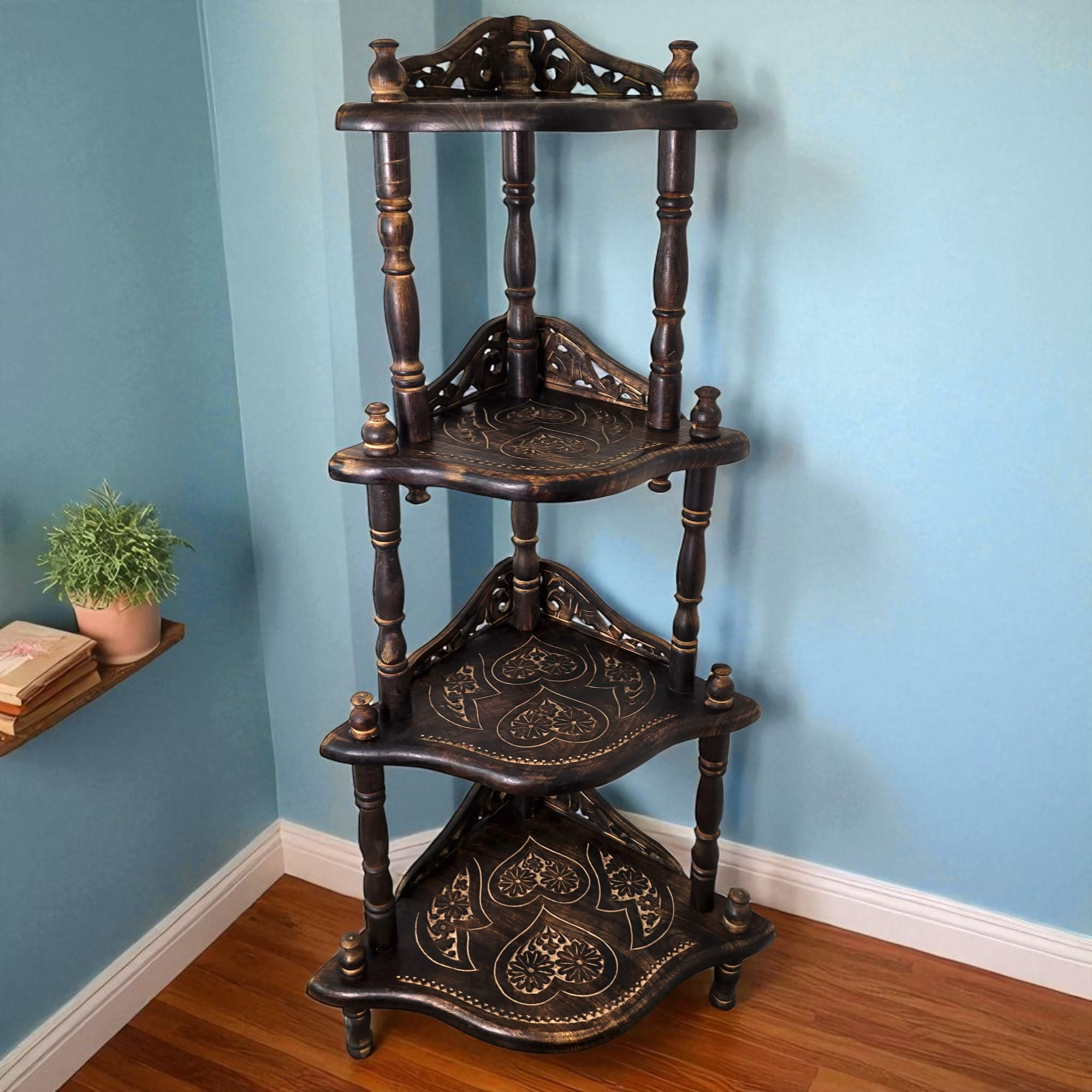 Этажерка идеально подходит для хранения книг, декора и других предметов, предлагая достаточное количество места на каждой из четырех полок, каждая из которых имеет разный размер для удобства размещения различных вещей.