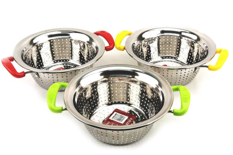 Дуршлаг 2205 оптом от производителя А-Плюс в Украине. Дуршлаг изготовлен из высококачественой нержавеющей стали, что обеспечивает данному товару надежность и долговечность в использовании. Наличие двух ручек, которые покрыты высококачественным пластиком, гарантирует безопасное пользование этой незаменимой посуды на кухне. Дуршлаг удобно использовать как в горячей, так и холодной воде, легко моется и имеет презентабельный вид. Преимуществом является небольшой вес, рациональный размер. Устойчив в использовании, так как имеет плоское дно. Наличие цветных ручек создает настроение на любой кухне.