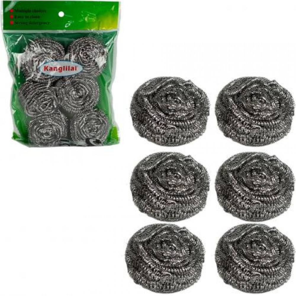 Металева губка-скребок для миття посуду — надійний засіб для видалення жиру, нагару та стійких забруднень. Діаметр однієї губки — 6,5 см. Виготовлена з міцного сталевого дроту, стійка до зношування та підходить для багаторазового використання. В упаковці 6 штук. Губка-скребок затребувана у побуті та професійній сфері, що робить її вигідним товаром для гуртових закупівель.