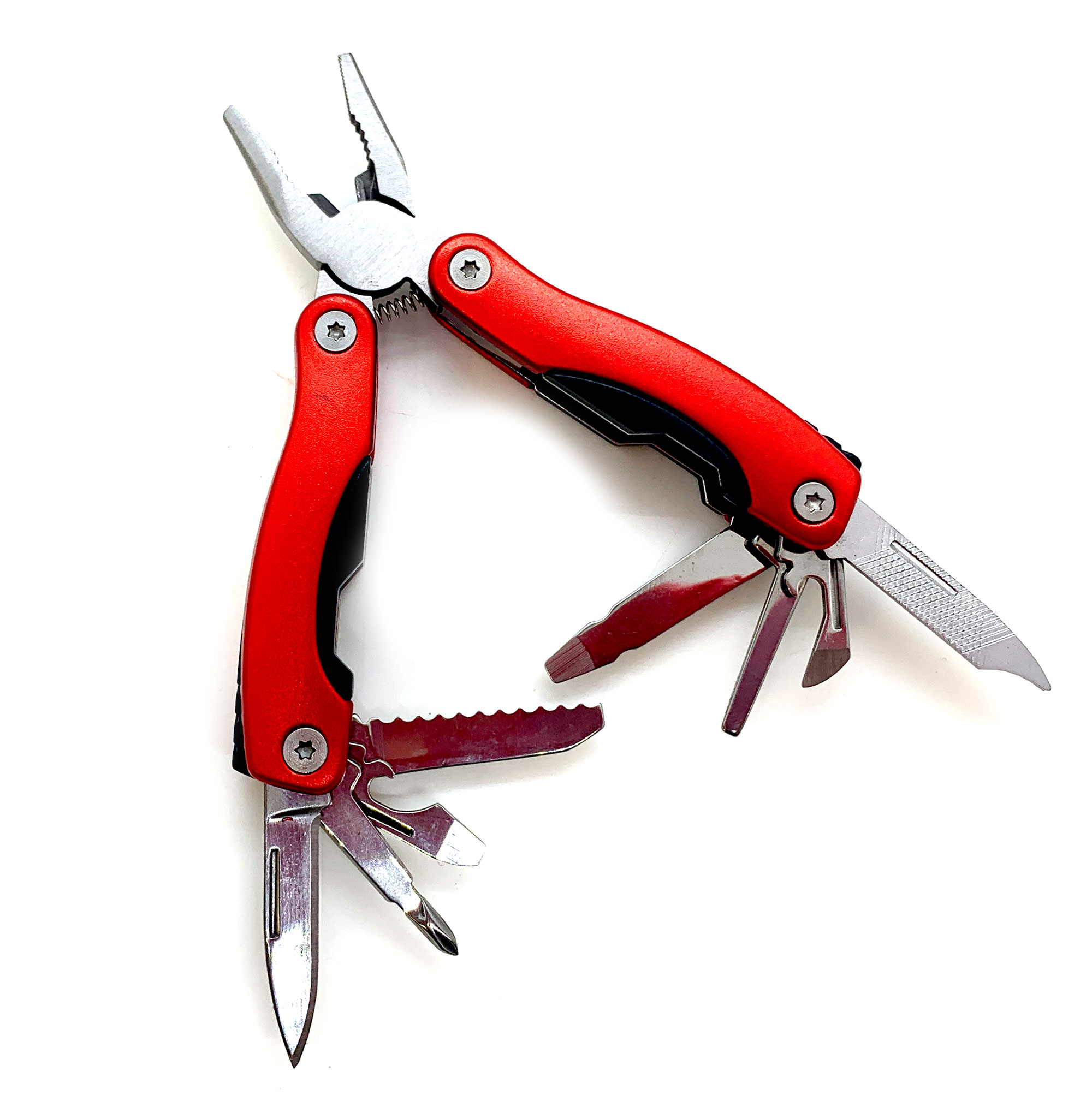 В состав мультитула входят плоскогубцы, которые позволяют легко выполнять задачи по сжатию и разжатию предметов. Также включены пилочка, крестовая отвертка, открывашка с плоской отверткой, нож, пилочка для ногтей, специальная открывашка и плоская или шлицевая отвертка. размером 3 мм и 5 мм. Этот набор инструментов обеспечивает максимальную функциональность и готовность к различным задачам.