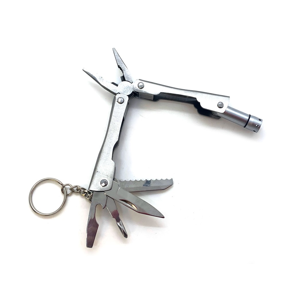 9 функций: в наборе вы найдете плоскогубцы, кусачки, открывалку для бутылок + отвертку, крестовую отвертку, ножовку, лезвие, фонарик, кольцо для ключей.