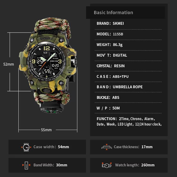 Часы наручные 1155BCMGN SKMEI PARACORD, GREEN CAMO, Compass, термометр, свисток, кресало