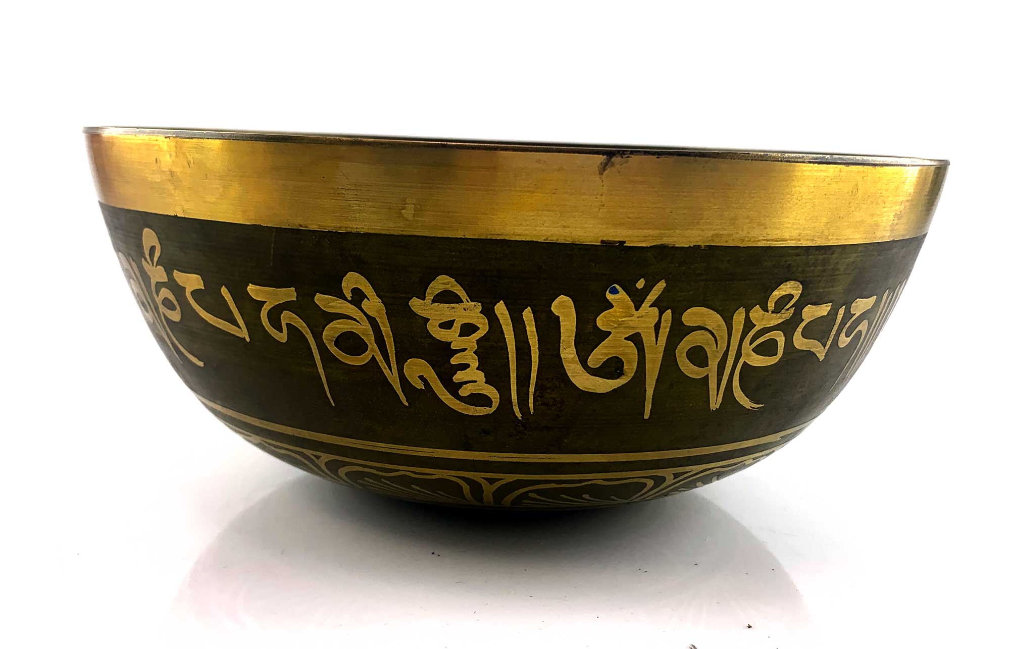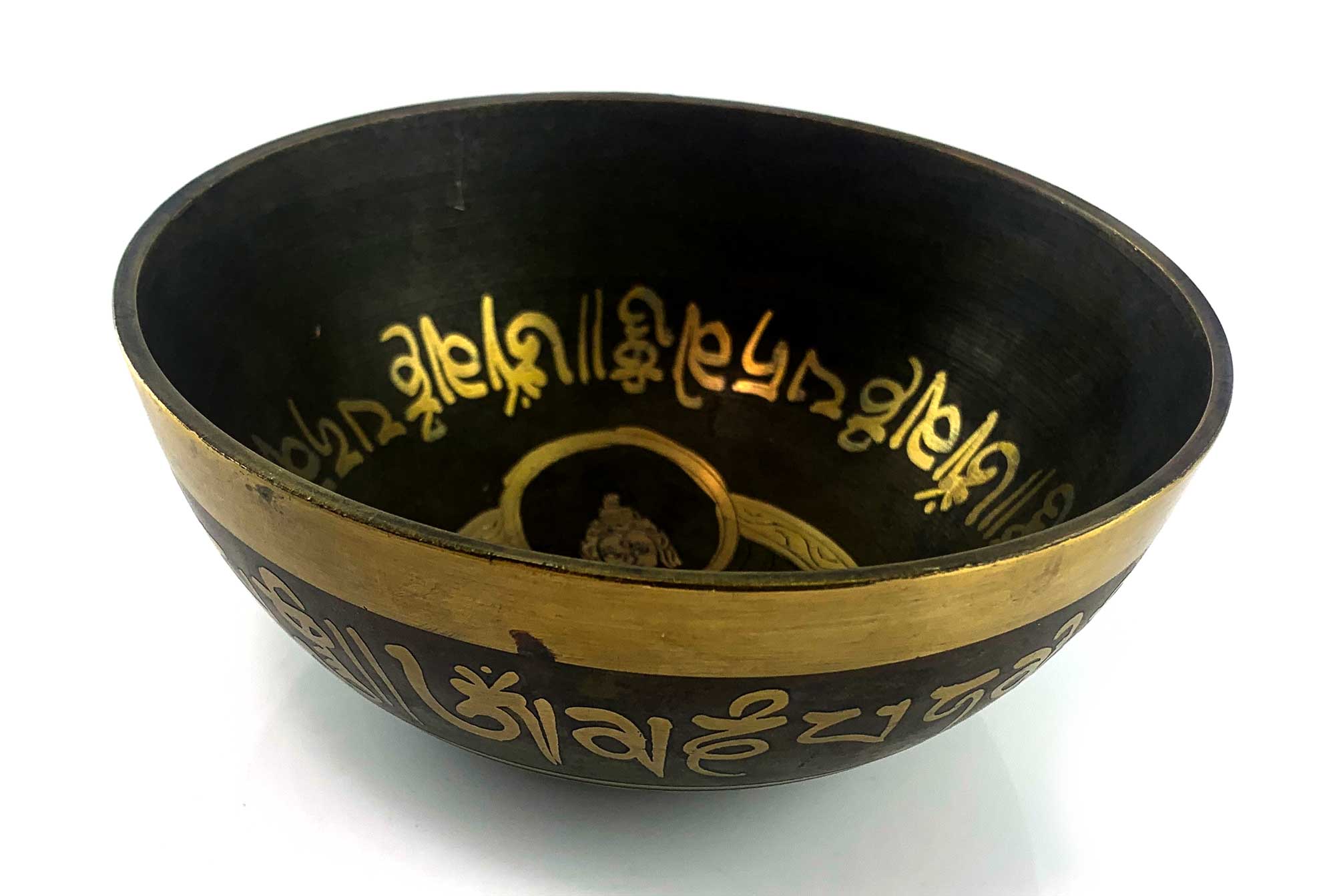 Представляем вам уникальную поющую чашу в темно-оливковом цвете, украшенную изображением Будды и таинственными надписями на Санскрите, выполненными золотистым цветом. Эта чаша представляет собой великолепный образец древних ремесел и духовной глубины.