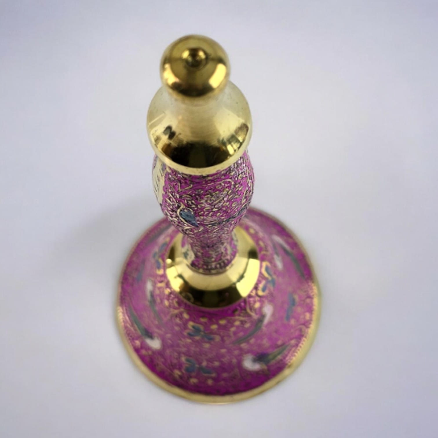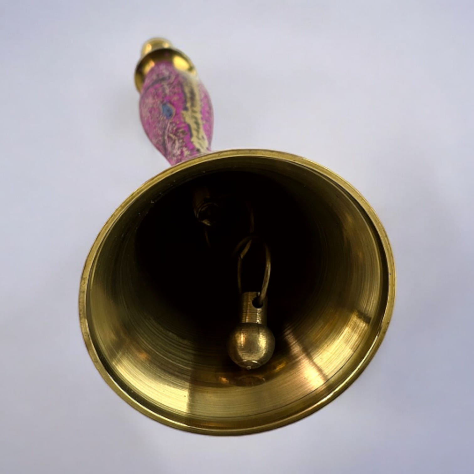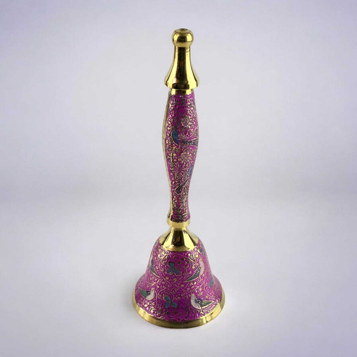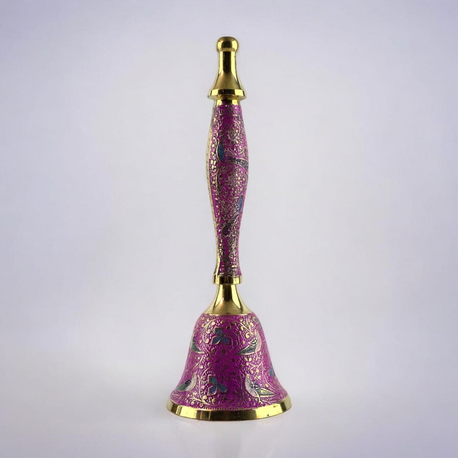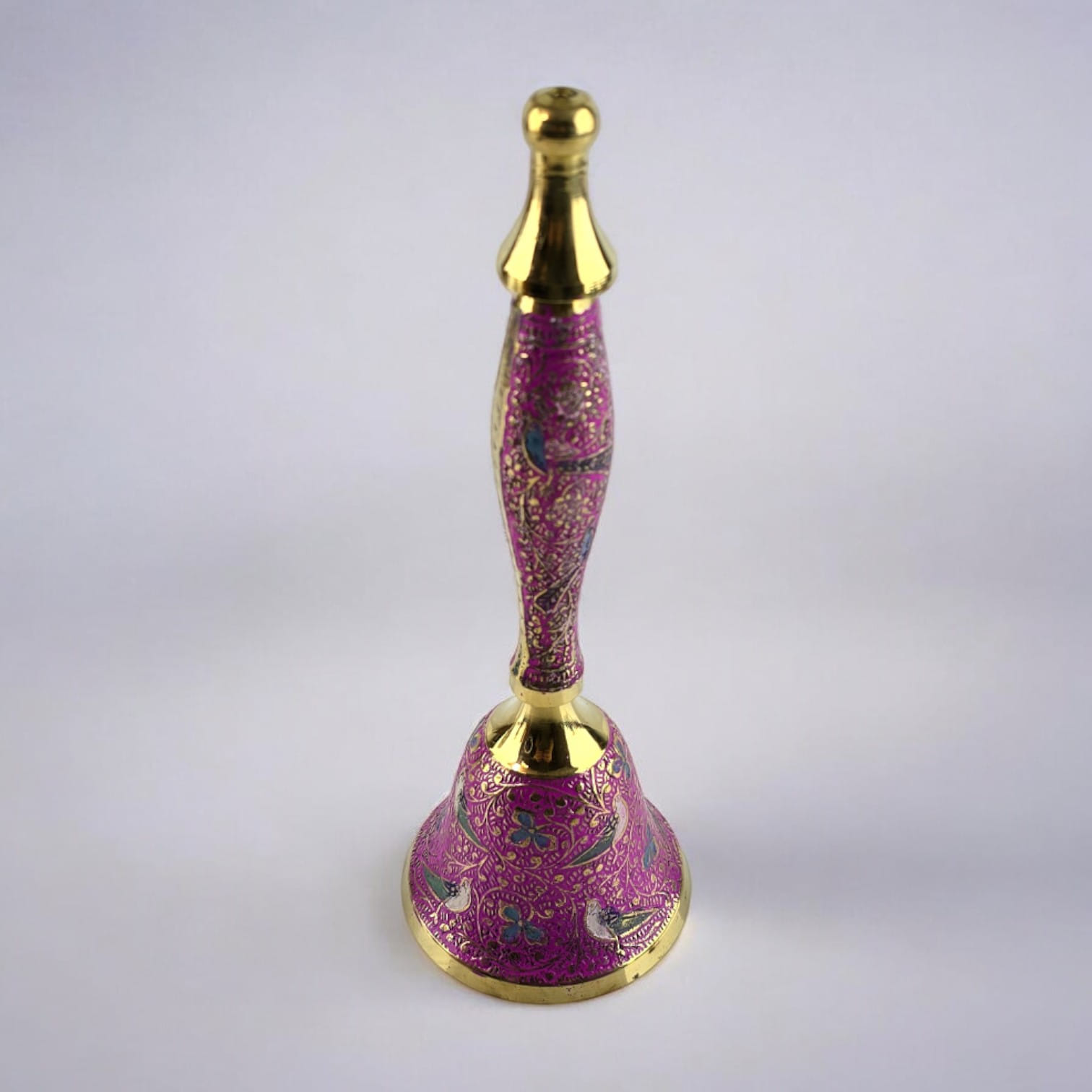 Колокольчик выполнен из бронзы, что обеспечивает его долговечность и приятный вес. Детали рисунка на розовом фоне отражают тонкость и изящество индийского искусства, создавая образ птиц, которые символизируют свободу и гармонию.