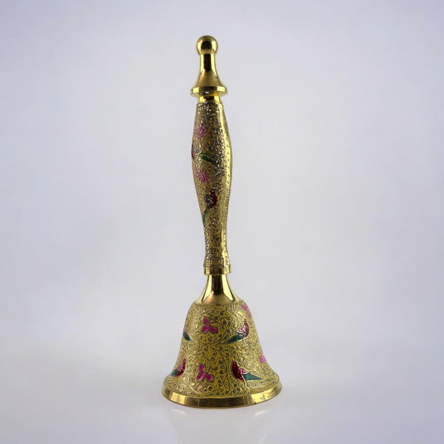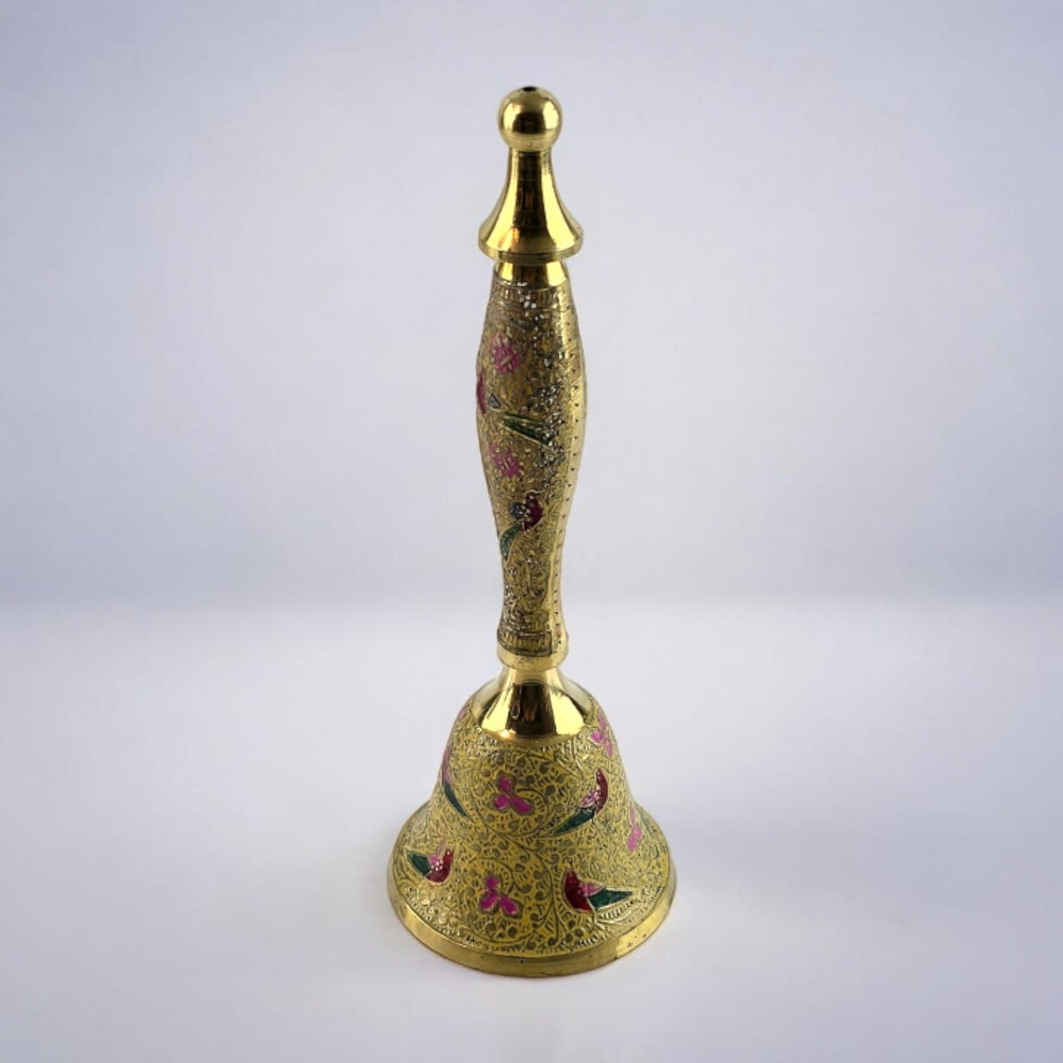 Колокольчик выполнен из бронзы, что обеспечивает его долговечность и приятный вес. Детали рисунка на желтом фоне отражают тонкость и изящество индийского искусства, создавая образ птиц, которые символизируют свободу и гармонию.