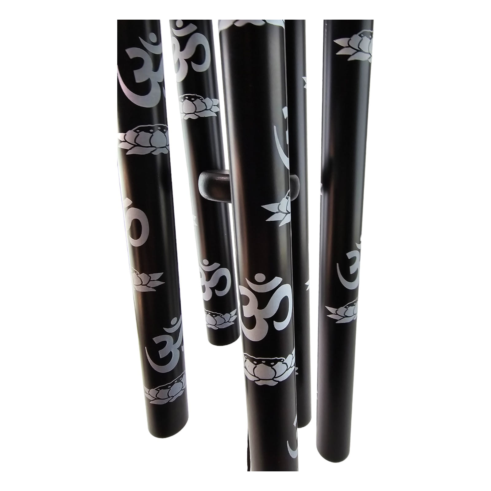Трубки крепятся на деревянном круге черного цвета, диаметром 130 мм. Над кругом есть удобное кольцо для крепления колокольчиков. Из центра круга висит нить длиной 500 мм с кругом черного цвета диаметром 70 мм и изображением ОМ белого цвета, по центру нити деревянный круг диаметром 50 мм.