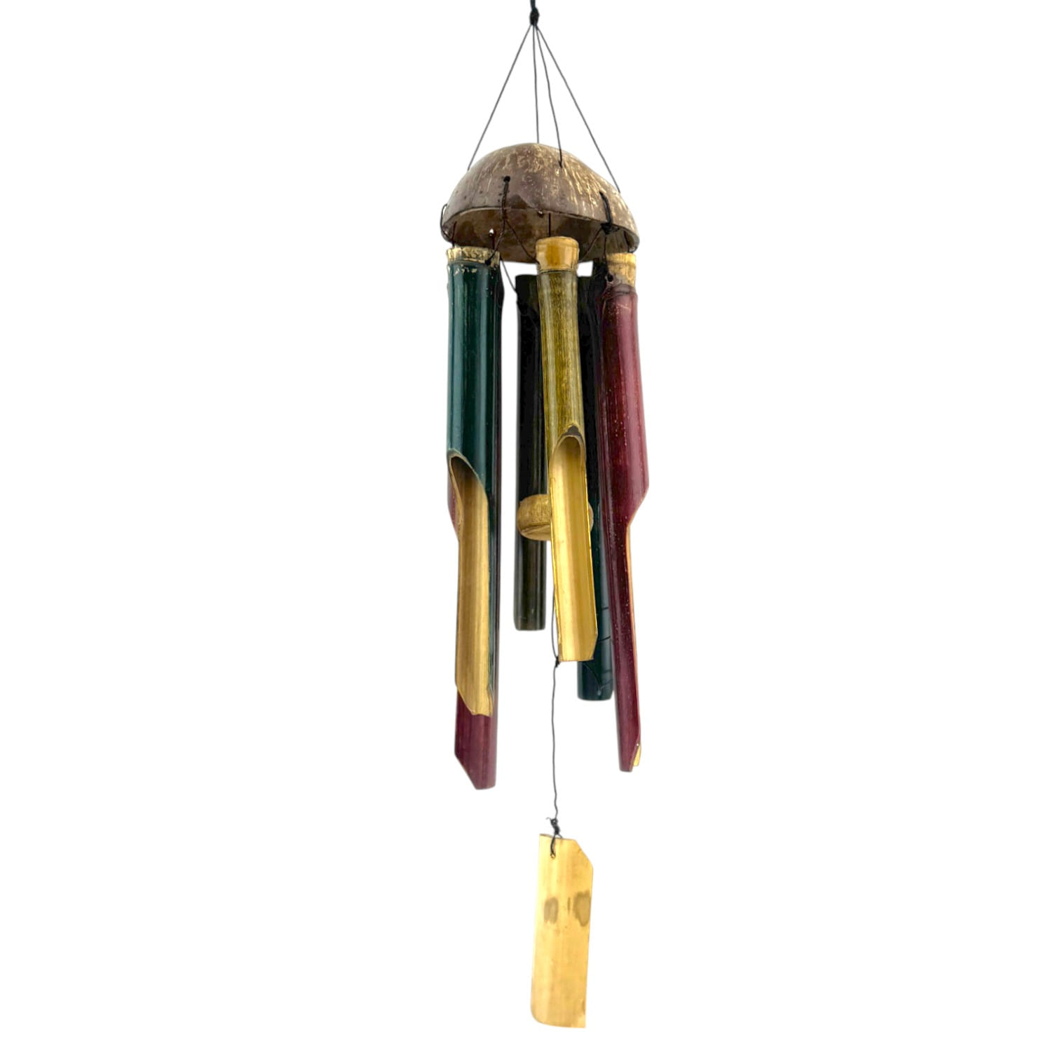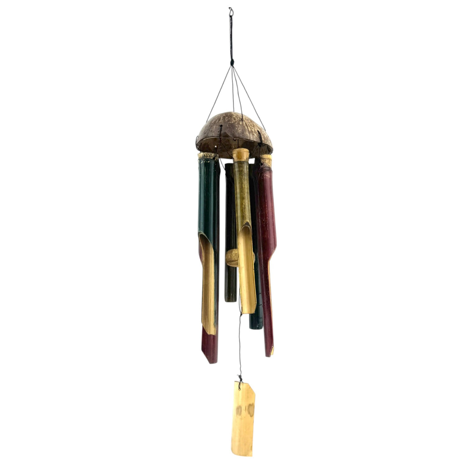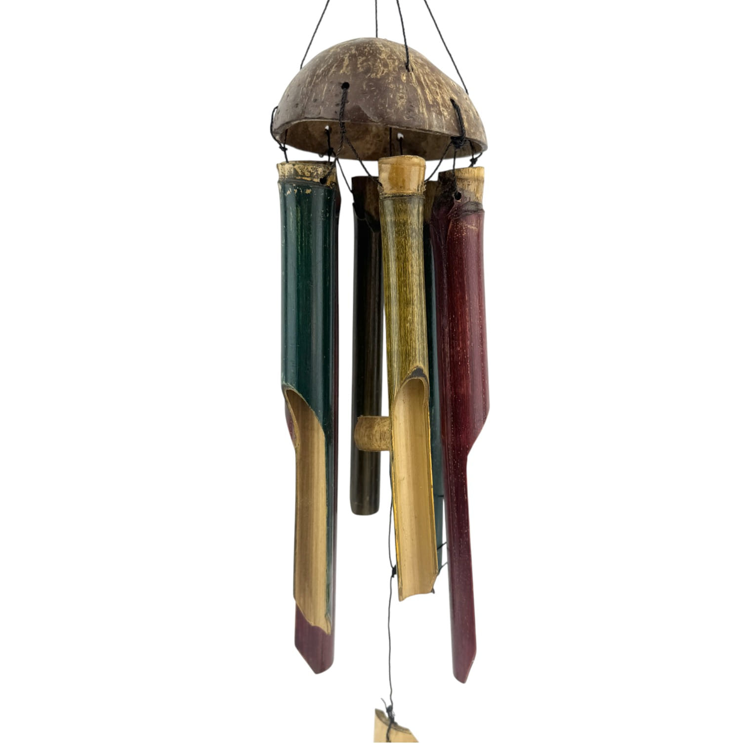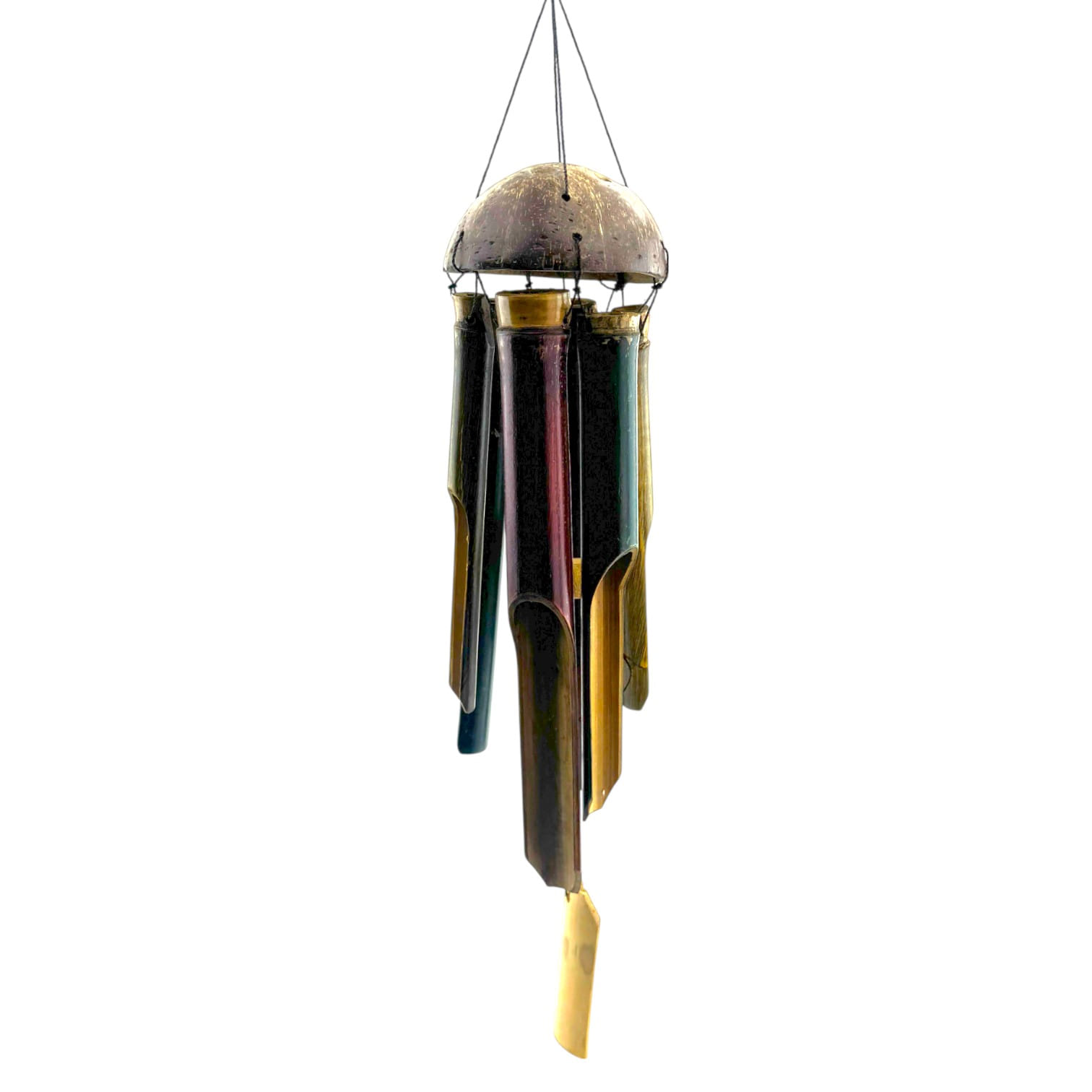 Данный экземпляр имеет трубочки длиной около 30 см и оформлен в тёплой природной гамме. Купол выполнен из половины кокосового ореха, подчеркивая этнический характер изделия. Отлично подходит для подвешивания на балконе, террасе, в саду или внутри дома, особенно в интерьерах в стиле бохо, эко или этно.