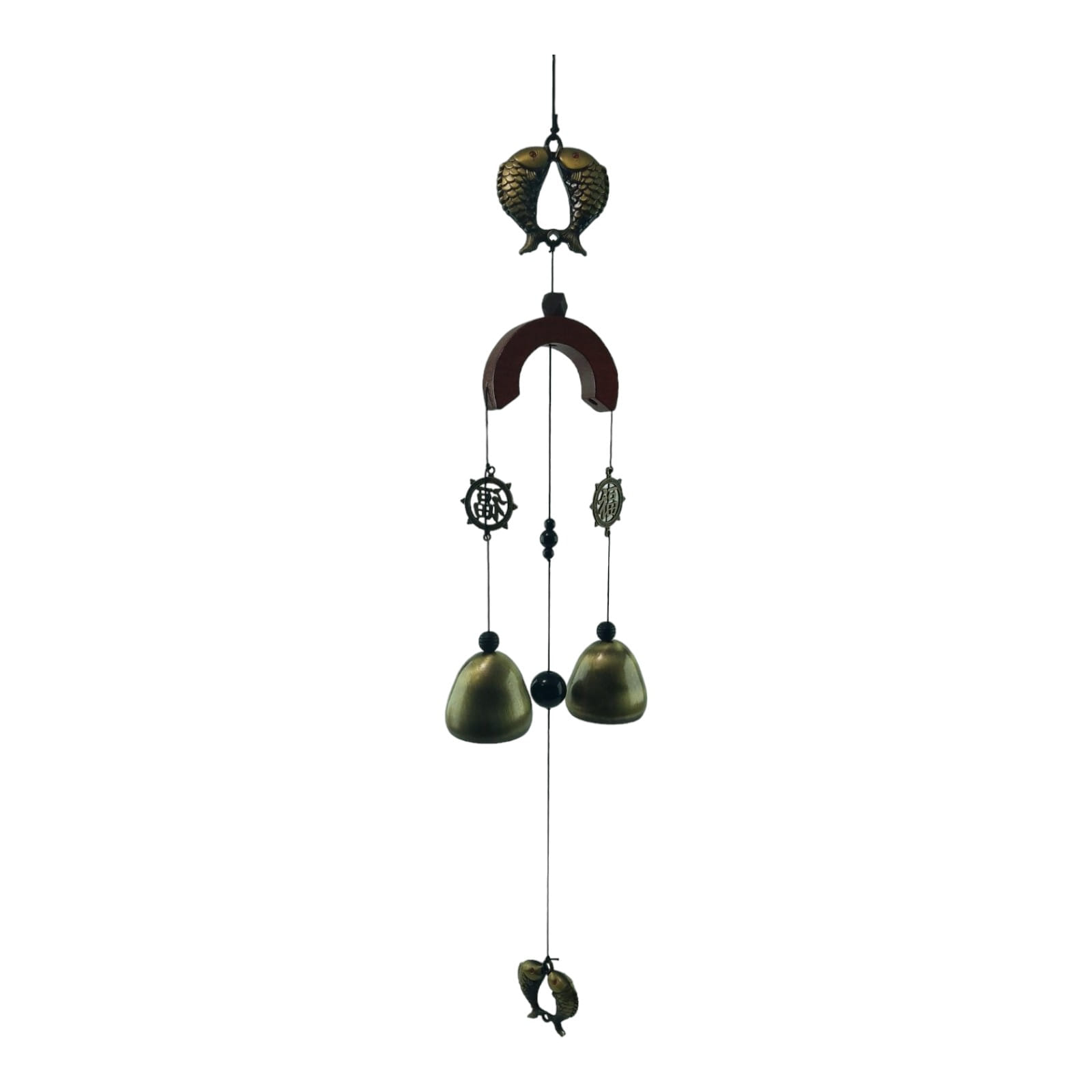 От дуги ветвятся три ветви, по бокам которых расположены два металлических знака "Благословение" размером 40х35х2 мм, приносящие с собой весть о добре и благополучии. Также на этих ветвях установлены два колокольчика высотой 40 мм с внешним диаметром 50 мм и внутренним диаметром 45 мм, создавая нежный звук, наполняющий окружающее пространство мелодией и умиротворением.