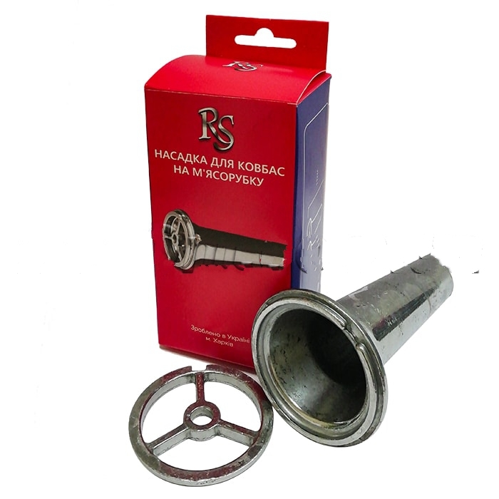 Устанавливается на мясорубку, в которой сняты нож и сетка. К узкой горловине присоединяют кишку, которую одной рукой нужно придерживать и контролировать равномерность её наполнения, а другой рукой необходимо крутить ручку мясорубки