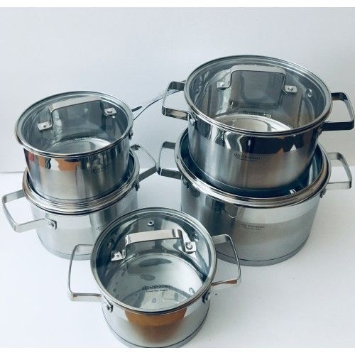 Изготовлены из высокопрочной нержавеющей стали, не подвергающейся коррозии и потускнению, имеет тяжёлое капсульное дно. Также отличается высокой теплопроводимостью и распределением температуры, что обеспечивает быстрое нагревание и длительное удержание тепла. Пригодна для любых видов плит, а также пригодна для мытья в посудомоечной машине. Имеет плоскую оригинальную форму и матовое покрытие. Ручки на посуде клёпанные. набор состоит из: