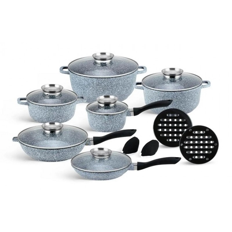 Набор из ковшика и кастрюль с антипригарным покрытием из гранита. Набор посуды имеет стеклянные крышки с дозатором для масла, благодаря чему вы можете постоянно заливать масло в держатель во время приготовления или тушения. Посуда Edenberg EB-8040 имеет индукционное дно, что делает их современными. В комплект входит три гранитных кастрюли с крышками, гранитный ковшик и две сковороды, также в комплекте 2 подставки под горячее. 3-хслойное антипригарное покрытие не влияет на вкус и запах пищи и предотвращает пригорание. Этот кухонный набор не содержит вредных веществ в своём составе и позволяет готовить пищу с минимальным количеством масла. Идеально для приготовления низкокалорийной, диетической еды. Уникальное индукционное дно экономит 35% энергии, обеспечивая равномерное распределение тепла по всей площади посуды. Съёмные силиконовые ручки soft-touch с бакелитовым покрытием не нагреваются и не скользят. Набор посуды Edenberg EB-8040 подходит для всех видов плит: газовых, электрических, индукционных, галогенных и стеклокерамических. Можно мыть в посудомоечной машине. Комплектация: Кастрюля-казан с крышкой 6,8 л, диаметр 28 см, Кастрюля-казан с крышкой 4,5 л, диаметр 24 см, Кастрюля-казан с крышкой 2,3 л, диаметр 20 см, Ковшик с крышкой 1,5 л, диаметр 16 см, Сковорода с крышкой 2,4 л, диаметр 24 см, Сковорода с крышкой 3,3 л, диаметр 28 см, Подставки под горячее: 2 шт