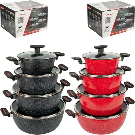 Набір каструль з мармуровим антипригарним покриттям підходить для приготування різних страв і щоденного використання на кухні. До комплекту входять 4 каструлі об’ємом 2 л, 4 л, 5 л та 6 л. Діаметр становить 20 см, 24 см, 28 см і 32 см відповідно. Усі каструлі комплектуються скляними кришками з металевим ободом. Корпус виготовлений з алюмінію з мармуровим антипригарним покриттям, що зменшує прилипання продуктів і полегшує догляд. Ручки на каструлях фіксовані, ручки на кришках знімні та виконані з термостійкого пластику. Набір підходить для всіх видів плит. Поставляється в коробці розміром 39×34×28 см. Ціна вказана за набір. Товар вигідний для оптових магазинів і підходить для роздрібного продажу.