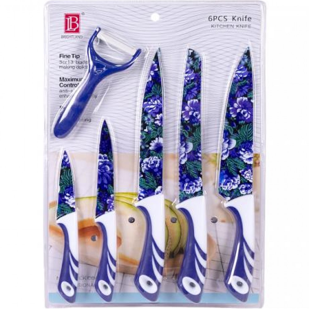 Набір кольорових ножів. У наборі 6 предметів: горизонтальна овощечистка, 5 ножів. Забарвлення в асортименті. Матеріал: метал, пластик. блістер 27* 40 см Розмір лез 20, 19, 19, 12,5, 8,5 см