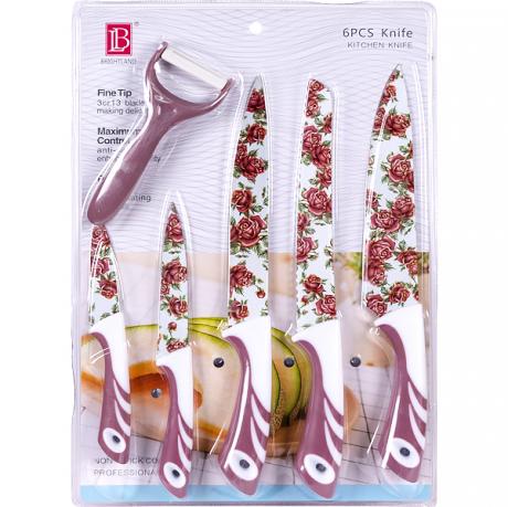 Набір кольорових ножів. У наборі 6 предметів: горизонтальна овощечистка, 5 ножів. Забарвлення в асортименті. Матеріал: метал, пластик. блістер 27* 40 см Розмір лез 20, 19, 19, 12,5, 8,5 см