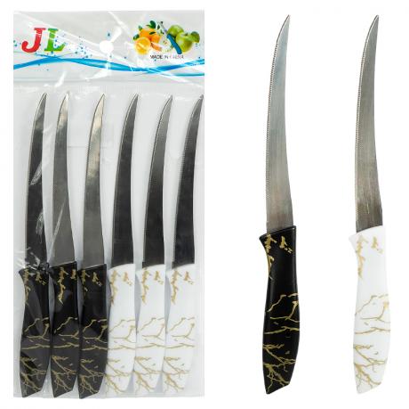 Набір кухонних ножів 6 шт — універсальний комплект для щоденного використання. Леза з нержавіючої сталі гарантують відмінну гостроту та довговічність, а ергономічні пластикові ручки зручні у використанні та запобігають ковзанню. Підходять для нарізання м’яса, овочів, фруктів і хліба. Компактне пакування робить набір зручним для зберігання та транспортування.