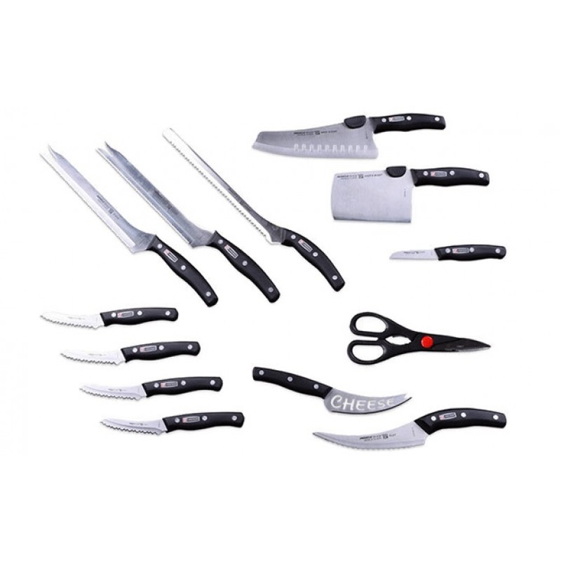 Ножи Miracle Blade - это лучшее соотношение качества и цены. Набор ножей Miracle Blade - это универсальные ножи, которые сочетают в себе классический дизайн и функциональность. Ножи Miracle Blade изготовлены по немецкой технологии, которая стала эталоном надежности и качества. Универсальный нож всегда нужен на кухне. При помощи универсального ножа Miracle Blade вы проделаете большинство операций по нарезке продуктов. Лезвие этого ножа имеет идеально гладкую поверхность, благодаря чему кусочки продуктов не прилипают к нему. Преимущества: Изготовлены из нержавеющей стали методом холодной ковки – острые, прочные и стойкие к появлению ржавчины! Нарезают продукты ровными срезами, не давит и не крошит их Легко разрежут даже замороженные продукты Идеально сбалансированная ручка Стильный дизайн Комплектация: нож для разделки мяса (кухонный нож) многофункциональный нож-резак нож для нарезки ломтиками (2 шт.) нож для чистки овощей. нож для нарезки сыра ножи столовые (4 шт.) кухонные ножницы нож для фруктов нож для филе