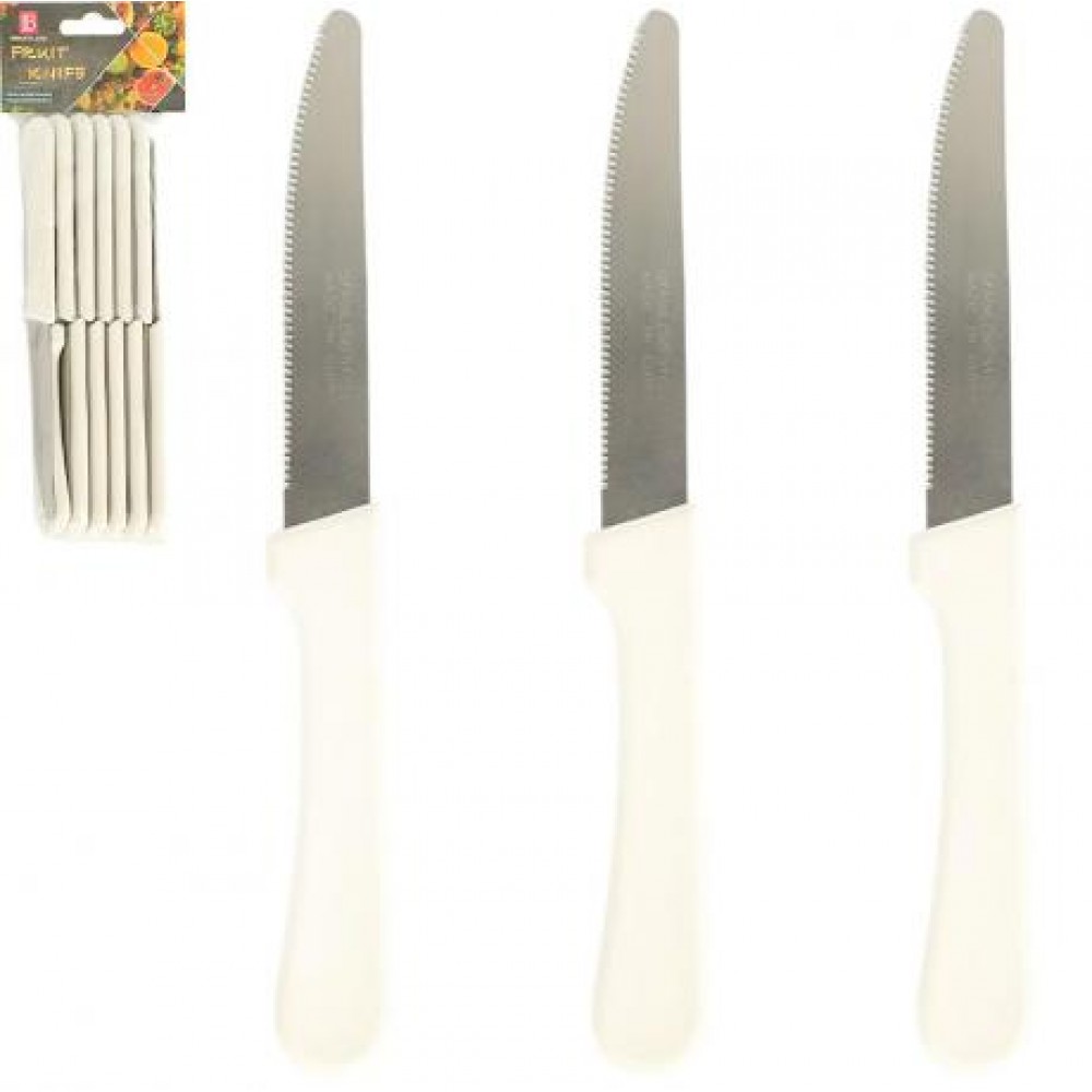 Набір кухонних ножів ZP6-12 з білими пластиковими ручками складається з 12 ножів довжиною 20,5 см, з лезом 10 см. Леза виготовлені з нержавіючої сталі та мають хвилясте заточення, яке забезпечує легке різання овочів, фруктів, хліба та інших продуктів. Зручні ергономічні ручки гарантують комфорт у використанні та надійний хват. Ідеальний набір для щоденного застосування на кухні.