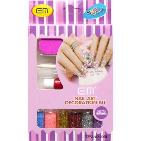 Створюйте професійний дизайн нігтів легко та зручно! У комплект входять пилочка, паличка-шпатель, спеціальний клей і 6 колбочок із різнокольоровим глітером. Усі елементи набору компактно упаковані в коробочку розміром 10×7,5×1,5 см, що робить його зручним для зберігання та використання. В упаковці 12 таких наборів – чудовий варіант для салонів краси та магазинів.