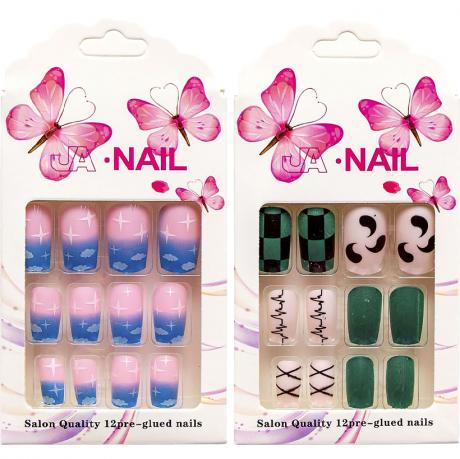 Накладні нігті повторюють форму натуральних, забезпечуючи щільне прилягання, природний вигляд і бездоганний манікюр. Вони кріпляться за допомогою спеціальних клейких пластин, що входять у комплект, що гарантує надійну фіксацію без зайвих зусиль. Ідеальний вибір для стильного образу в домашніх умовах.