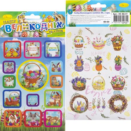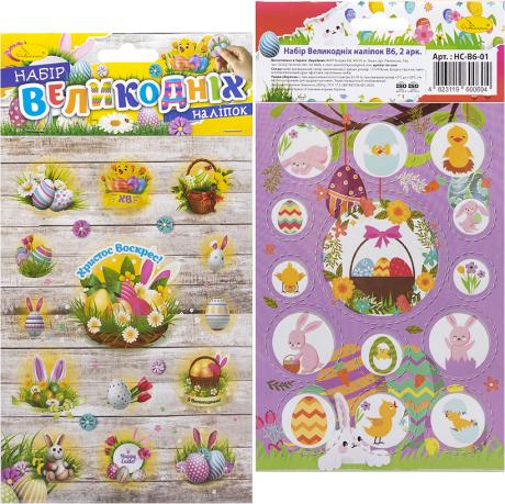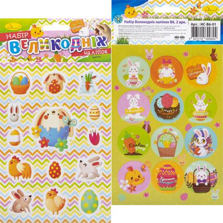 Набір наклейок "Великодніх" формату В6, містить 2 листи. Розміри одного листа: 11,5 см на 16,6 см.