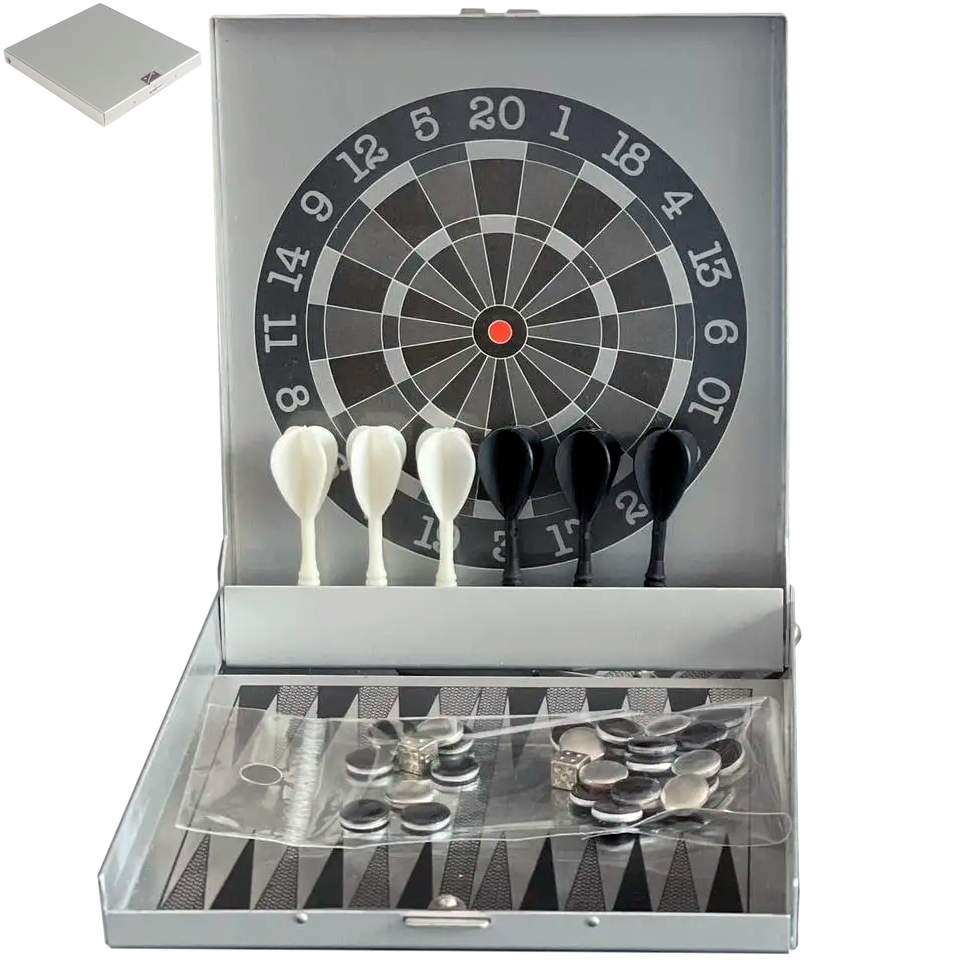 Практичный и стильный набор 2 в 1 объединяет две классические настольные игры — дартс и нарды. Всё размещено в прочном металлическом кейсе, который удобно брать с собой в поездки, на отдых или использовать дома и в офисе.
