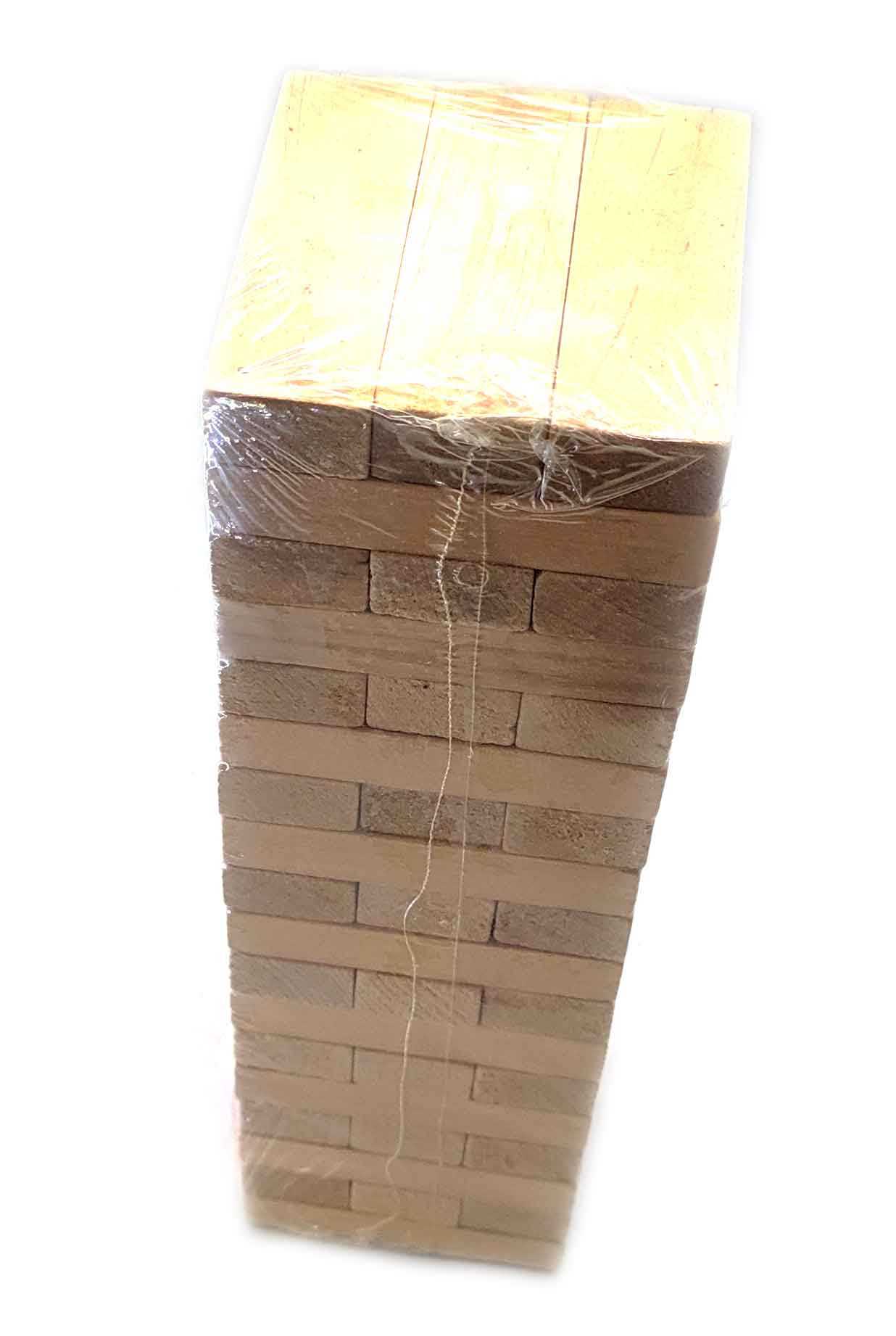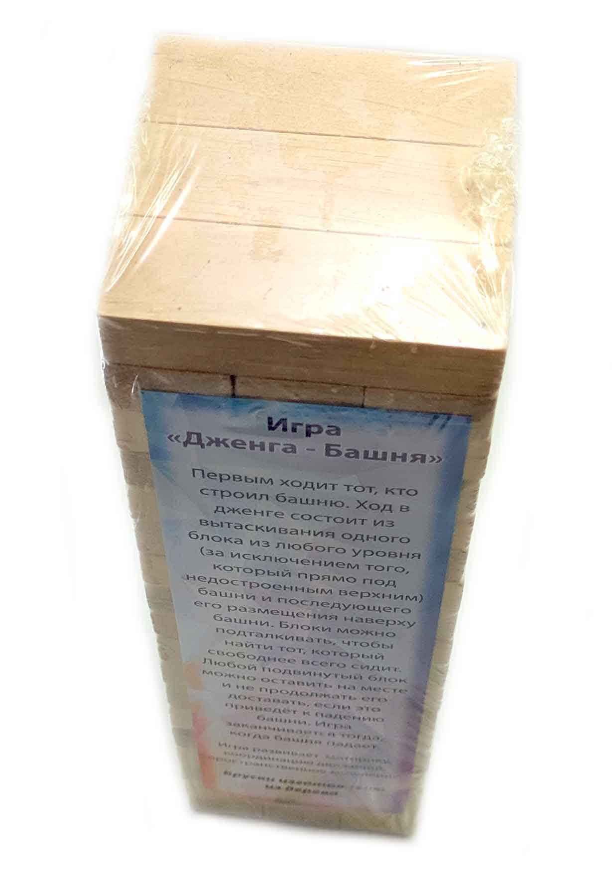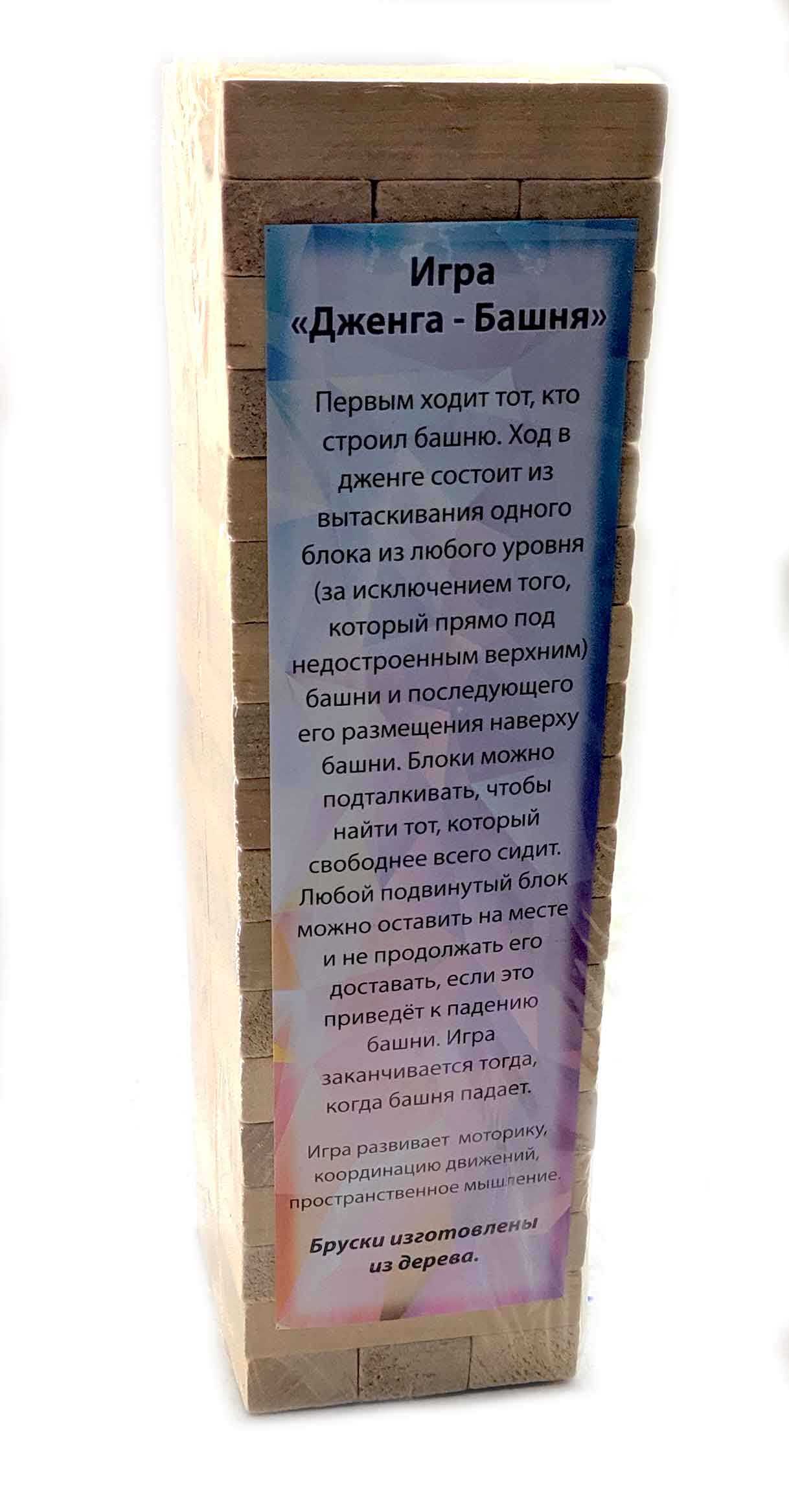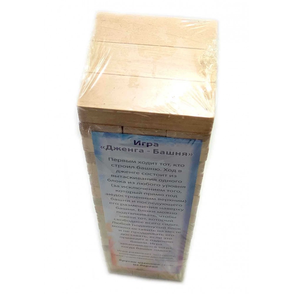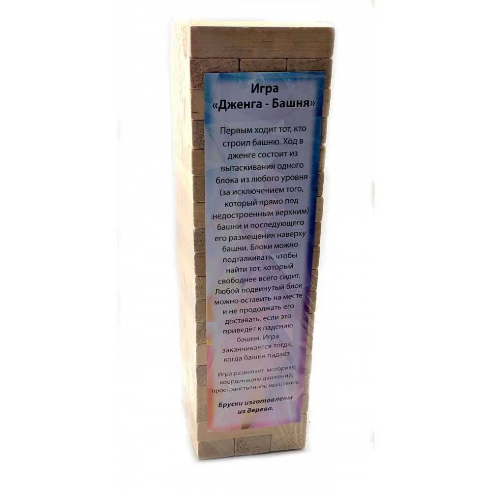 Дженга сделана из массива дерева.Дженга – это башня из деревянных брусков, которая растёт вверх, падает и снова растёт! Дженга – игра на ловкость рук, смекалку и чувство равновесия. В настольной игре Дженга (Jenga) Вам предстоит выстраивать башню из деревянных брусков, вынимая бруски с нижних «этажей» и докладывая их наверх.