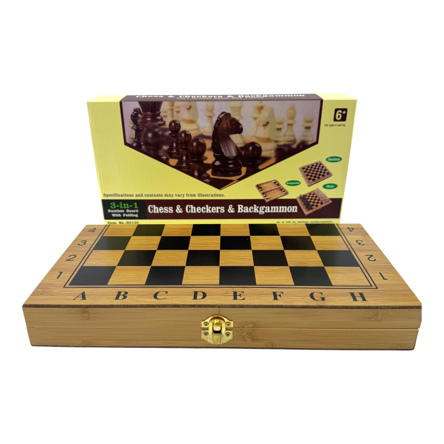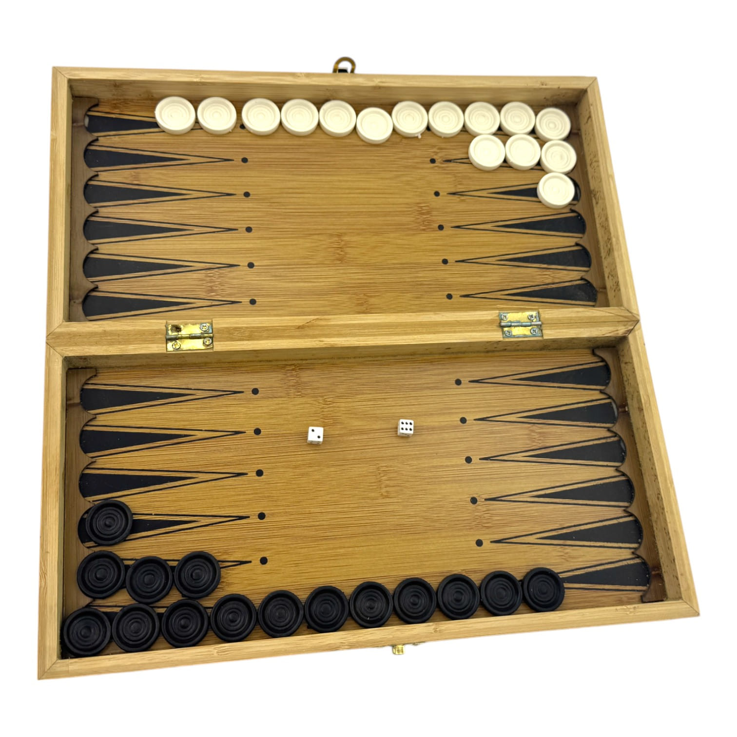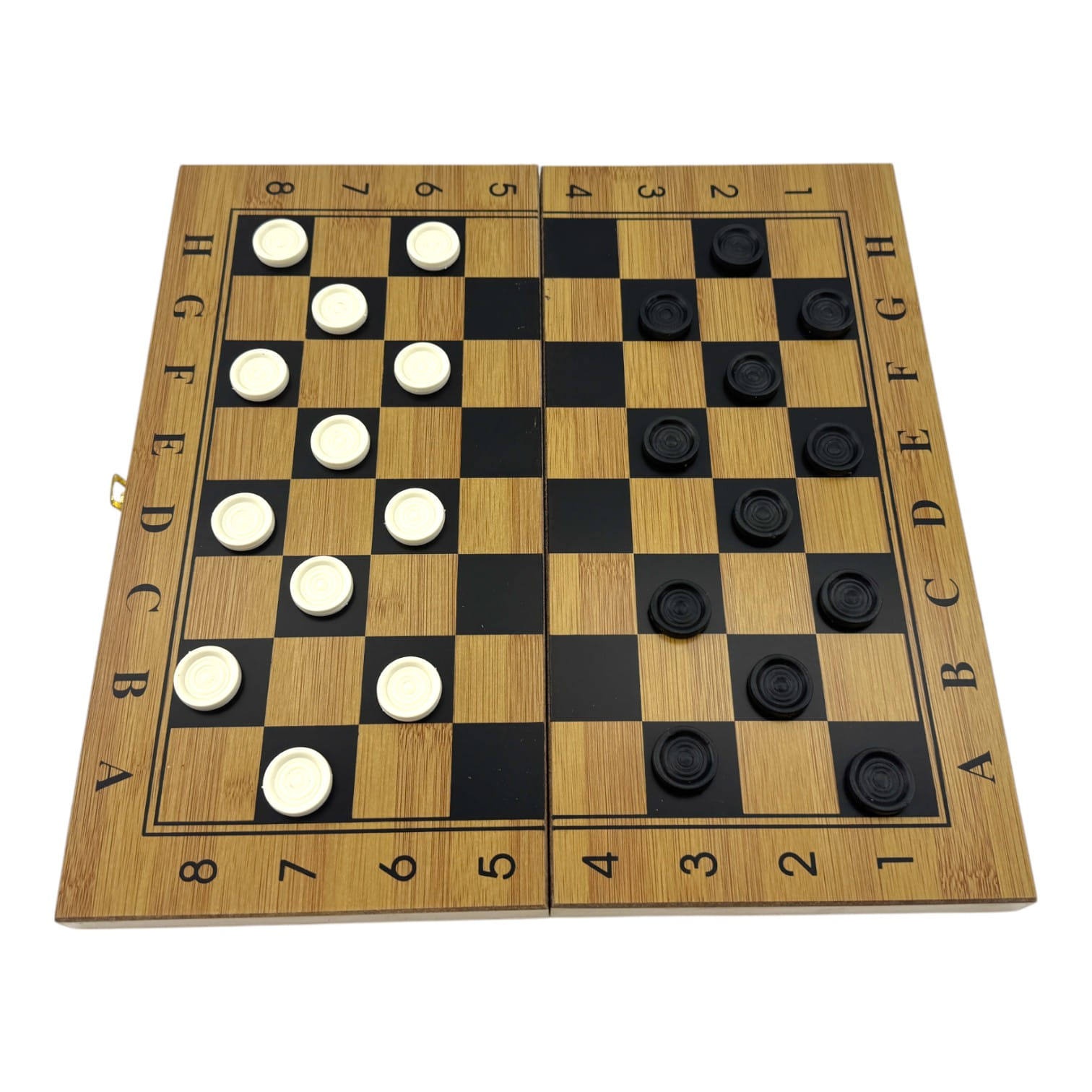 Доска выполнена из бамбука с двойной функцией: с одной стороны можно играть в шахматы и шашки, а с другой — в нарды. Она легко складывается и служит одновременно коробкой для хранения всех фигур и фишек, что удобно для транспортировки и сохранности.