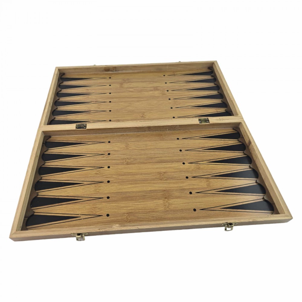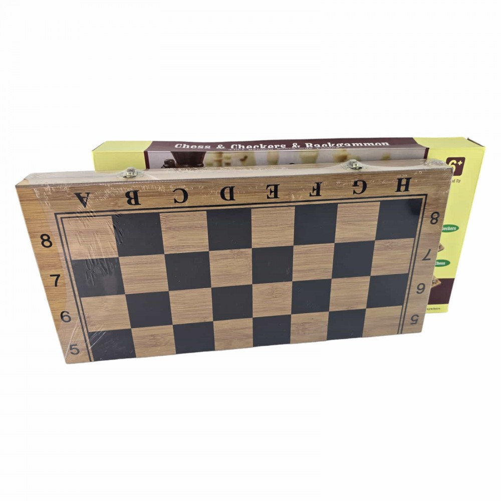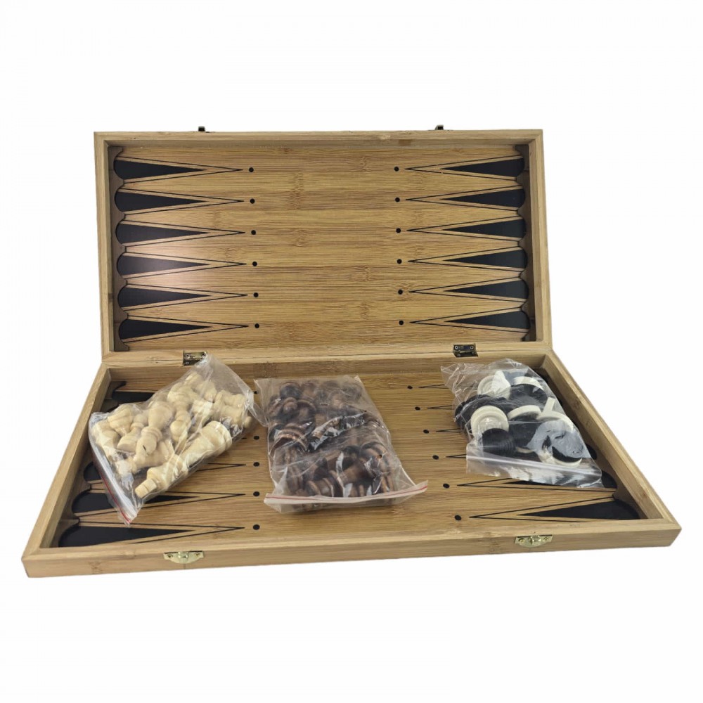 Представляем вам игровой набор, который включает шахматы, нарды и шашки - идеальный вариант для игры и развлечений в любом месте. Этот набор изготовлен из преимущественно из природных материалов: доска изготовлена из бамбука, шахматные фигуры - из дерева, а фишки и кубики - из пластика.