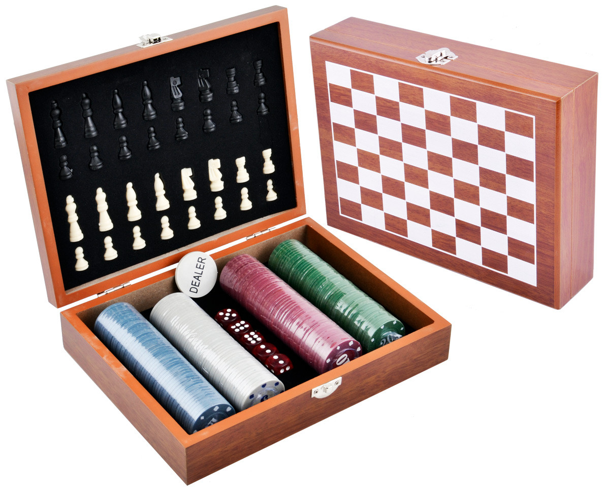Игровой набор шахматы/покерные фишки/кости, деревянная коробка 2518C