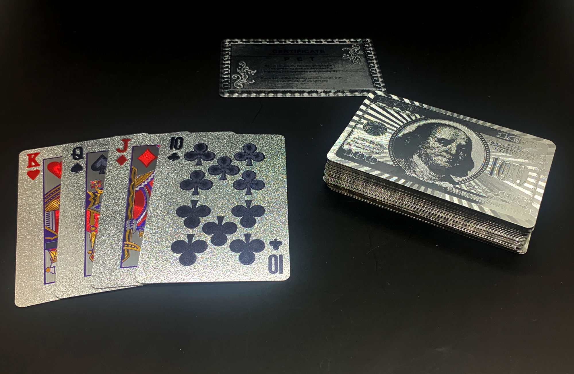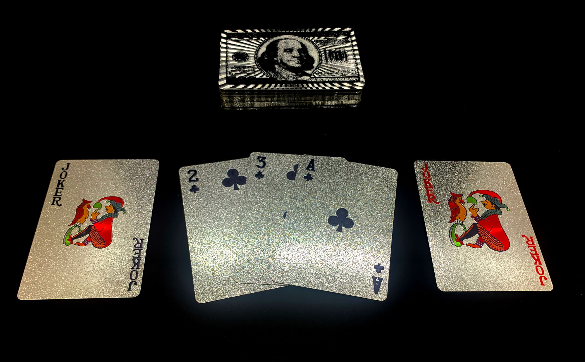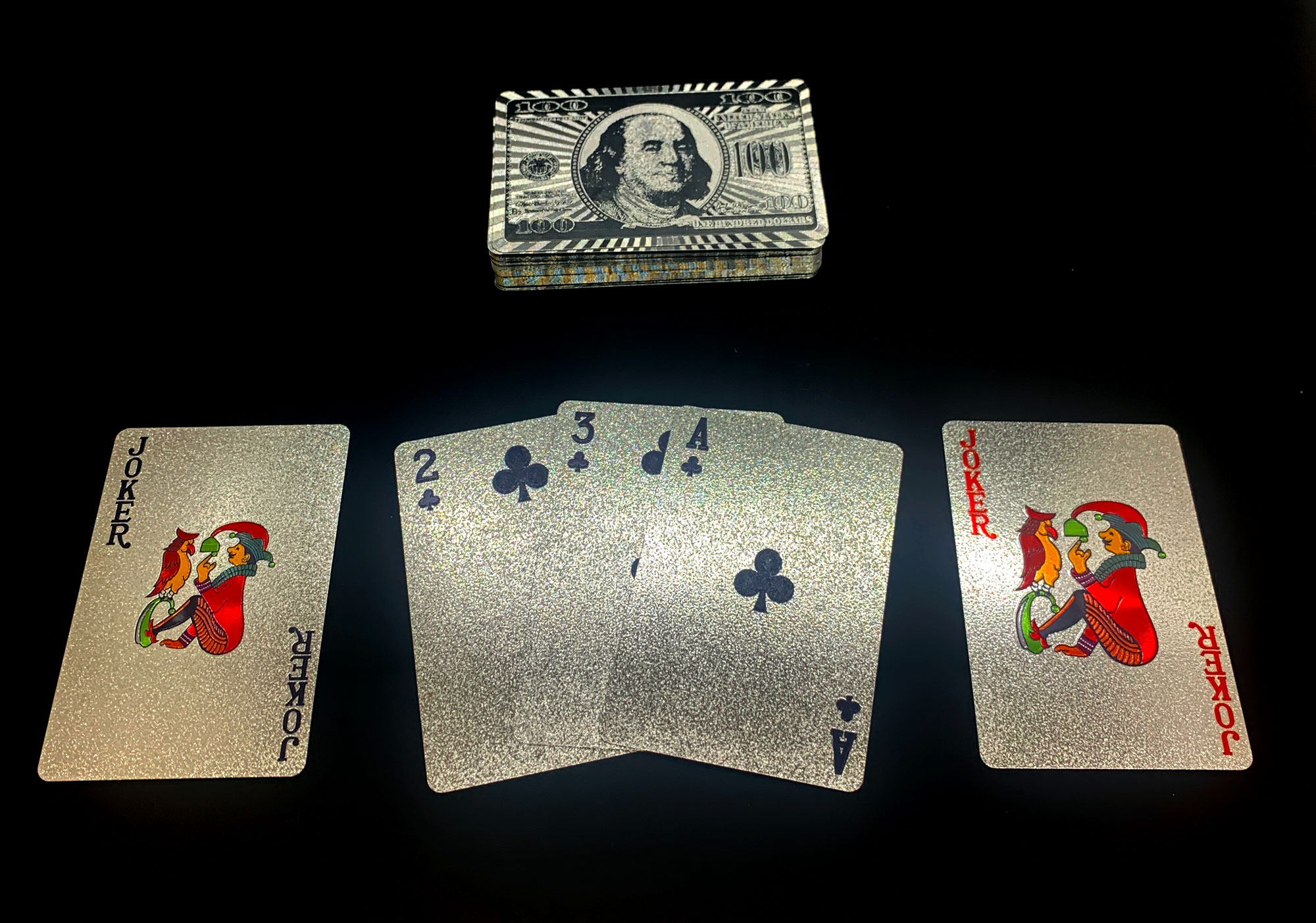 Карты "Серебряная Серия" имеют изображение 100-долларовой купюры, что придает им стильный и изысканный вид. Размер упаковки составляет 90х60х20 мм ,
