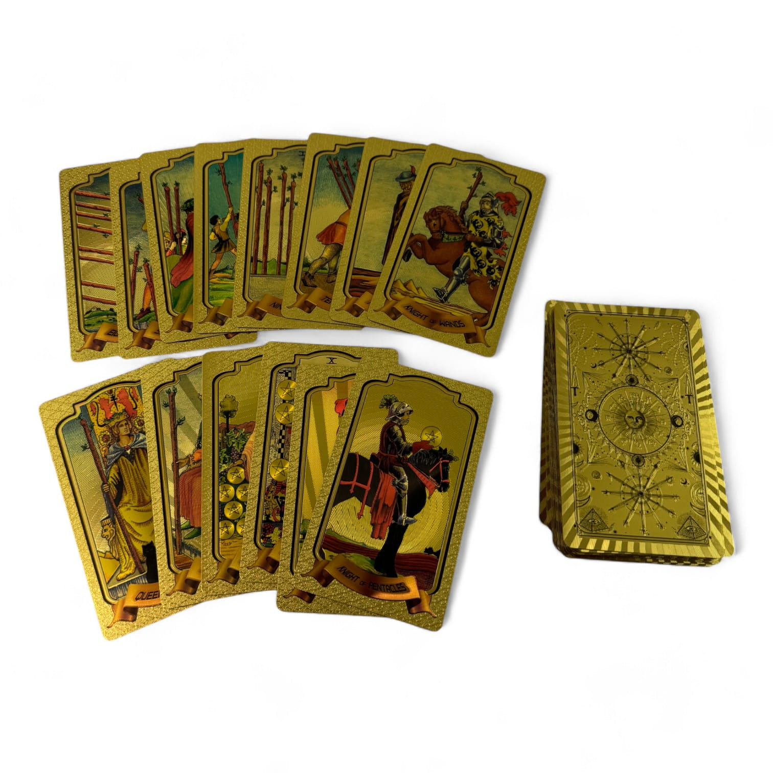 Карты Таро в классическом стиле Райдера-Уэйта. Это одна из самых популярных колод Таро, состоящая из 78 карт (22 карты Старших Арканов и 56 карт Младших Арканов). Карты выполнены из пластика с золотистым покрытием, что придает им более роскошный и долговечный вид.