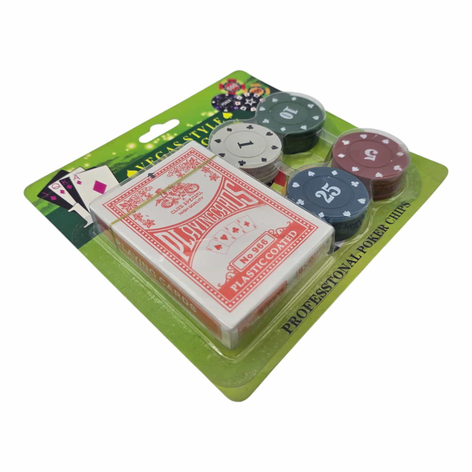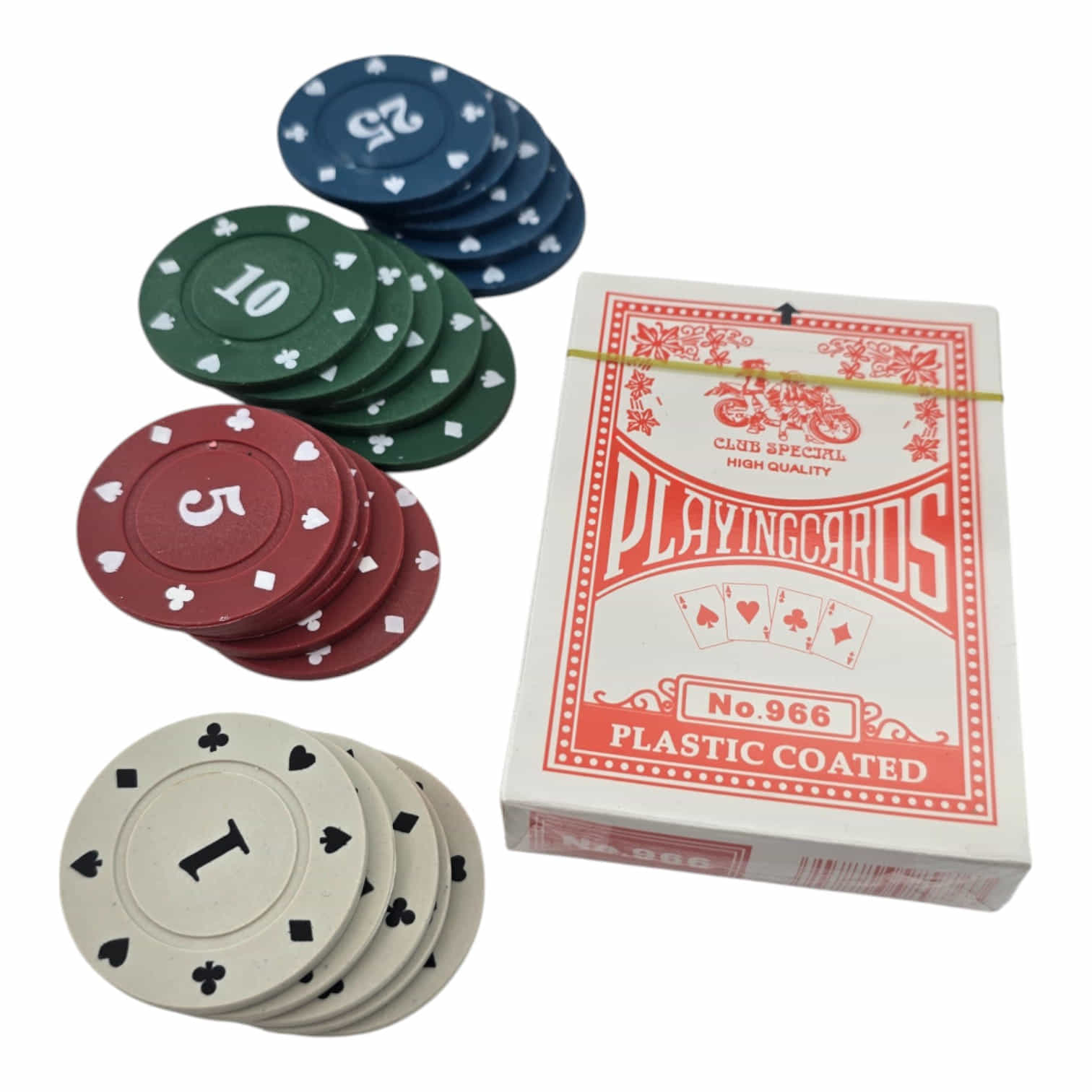 Фишки выполнены в классическом дизайне с символами мастей, что делает их удобными для быстрого считывания и добавляет профессиональный штрих в игровой процесс.