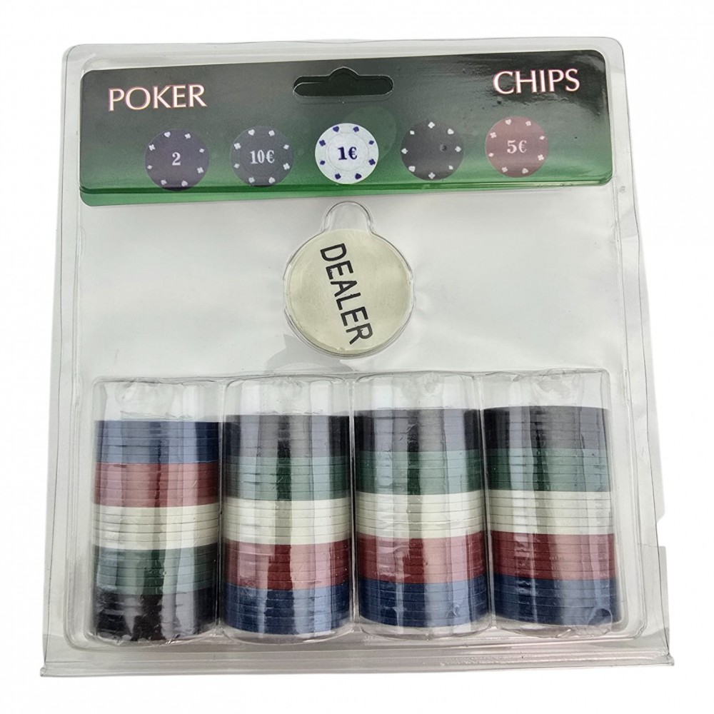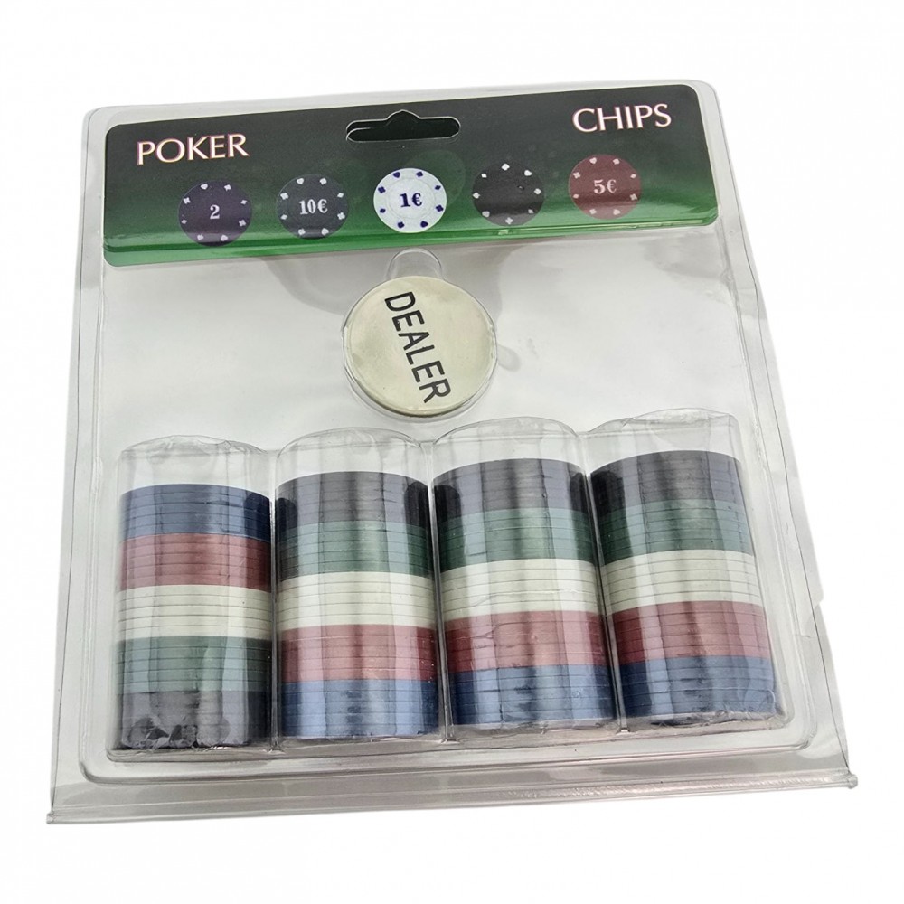 Набор для домашних покерных игр. В комплекте 100 фишек пяти номиналов по 20 штук каждого и фишка дилера. Прочные пластиковые фишки удобно мешать и собирать в стопки. Подходит для Техасского Холдема, Омахи и других карточных игр.