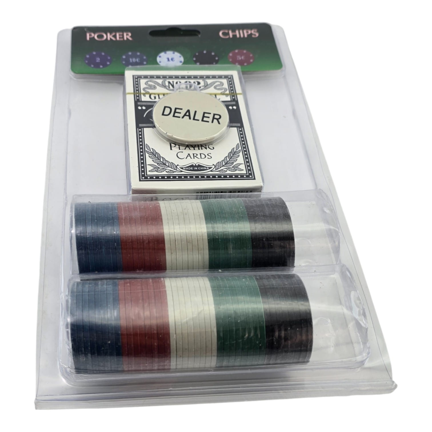 Практичный набор для домашних партий в покер. В комплекте 80 пластиковых фишек пяти номиналов по 16 штук, колода карт и жетон дилера. Фишки диаметром 3,8 см удобны в руке и износостойкие. Поставляется в блистерной упаковке, удобно брать с собой или дарить.