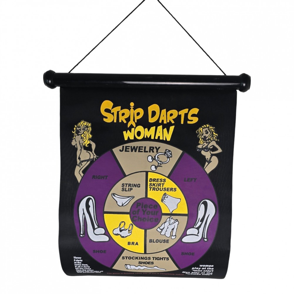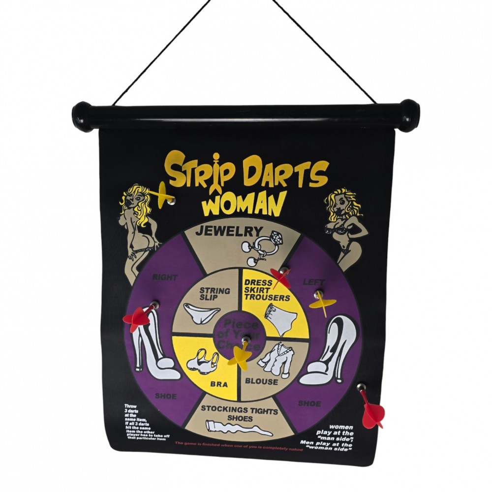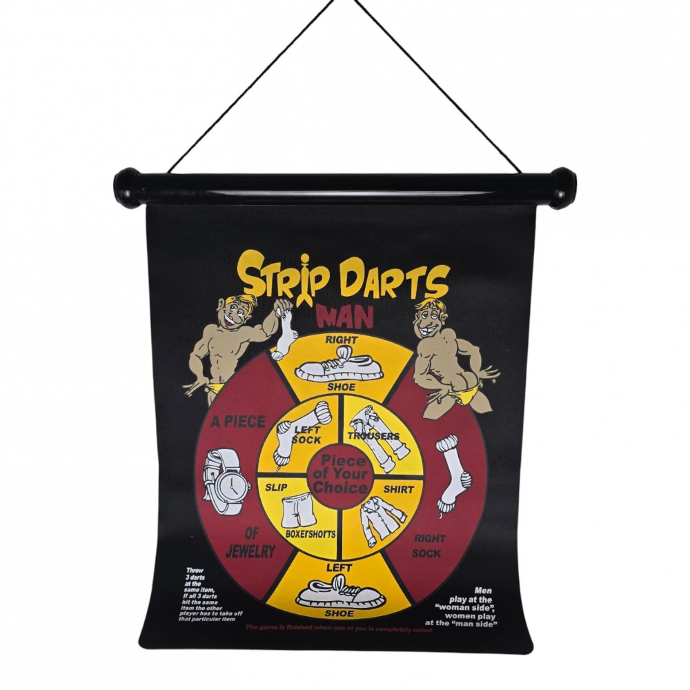 Двусторонний магнитный дартс "Strip Darts" - шуточная игра для взрослой компании. На одной стороне мишени правила для мужчины, на другой - для женщины, а поле поделено на секторы с элементами одежды и небольшими заданиями. Магнитные дротики надежно прилипают к полотну, не царапают стены и безопаснее классического дартса с иглами.