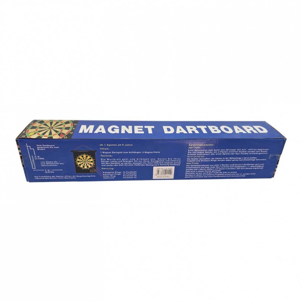 Комплектация: двусторонняя мишень, 6 магнитных дротиков (2 цвета), шнурок для подвеса, инструкция, коробка